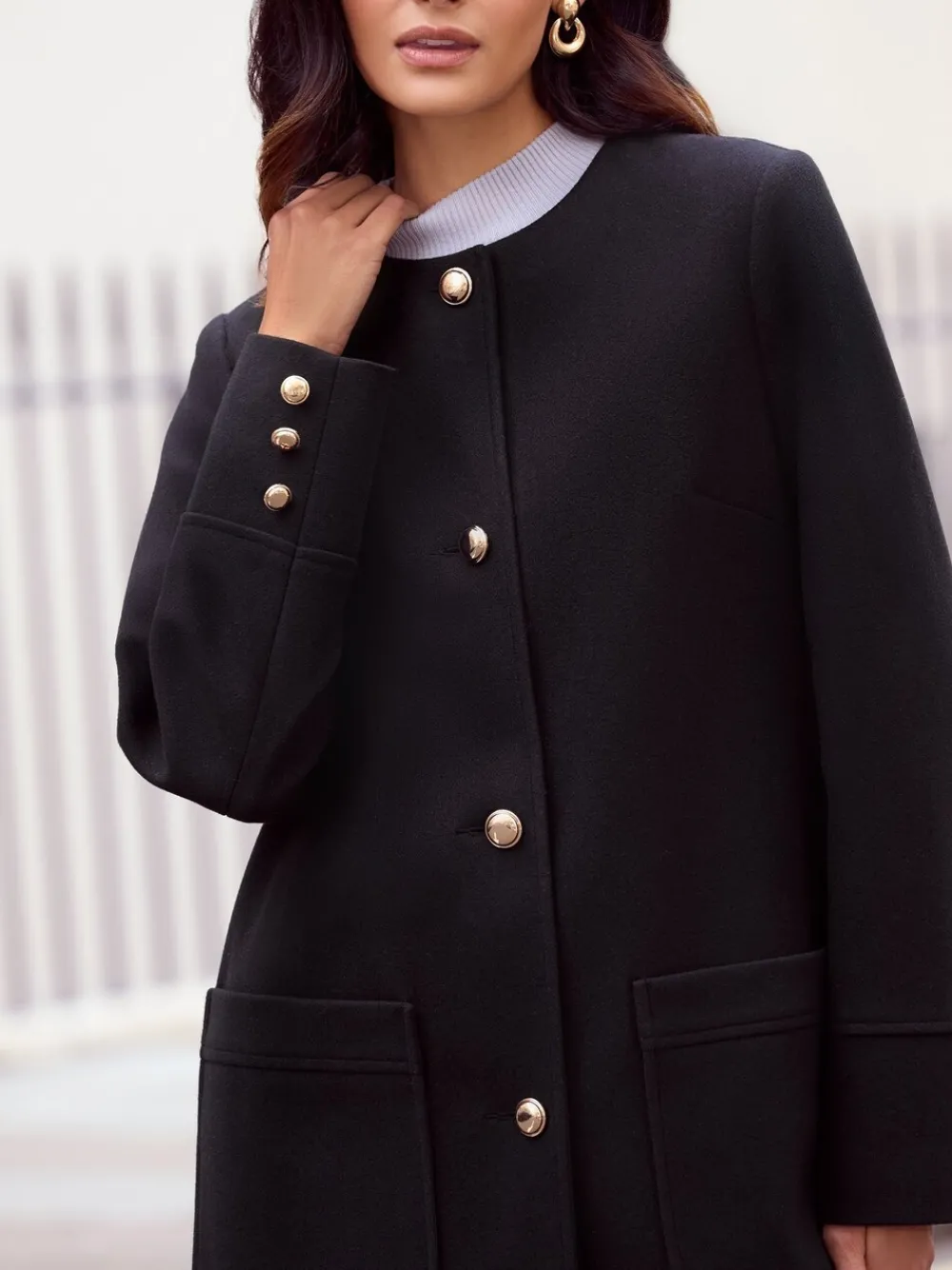 Achieve a polished, sophisticated look with this elegant smart midi coat. The chic collarless design and structured fit make it perfect for layering over workwear or evening dresses. Bold metallic buttons adorn the front fastening, cuffs, and deep pockets, adding a refined, luxurious finish to this timeless coat. Collarless design Button front with metallic buttons Midi length Deep functional pockets Hoofdbestanddeel 100% polyester. Voering 100% polyester.