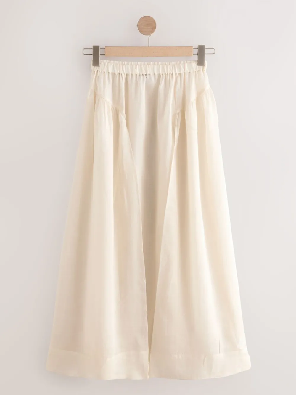 Elevate your wardrobe with this stylish, neutral-coloured midi skirt, part of a chic co-ord set. Featuring an elasticated waistband for a comfortable fit, its elegant front splits add a touch of movement and flair. This versatile piece is perfect for a fashionable day-to-night look. Elasticated waistband Front splits Part of a co-ord Midi length Machinewasbaar. 50% Ramie, 50% TENCEL™ lyocell. Artikelen met het curve-logo zijn verkrijgbaar in de maten 18 en groter.