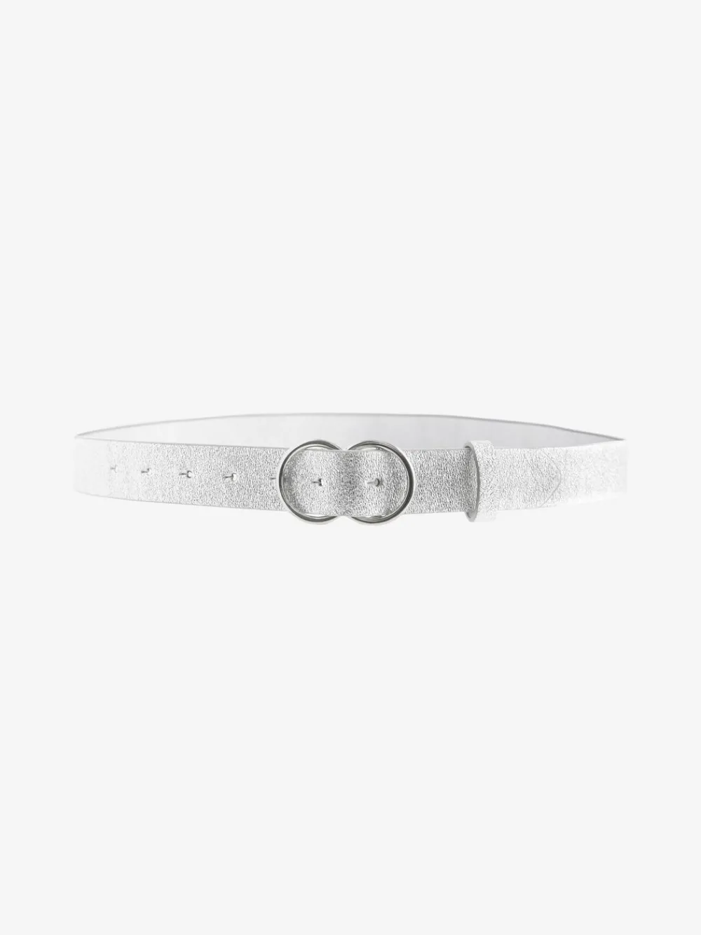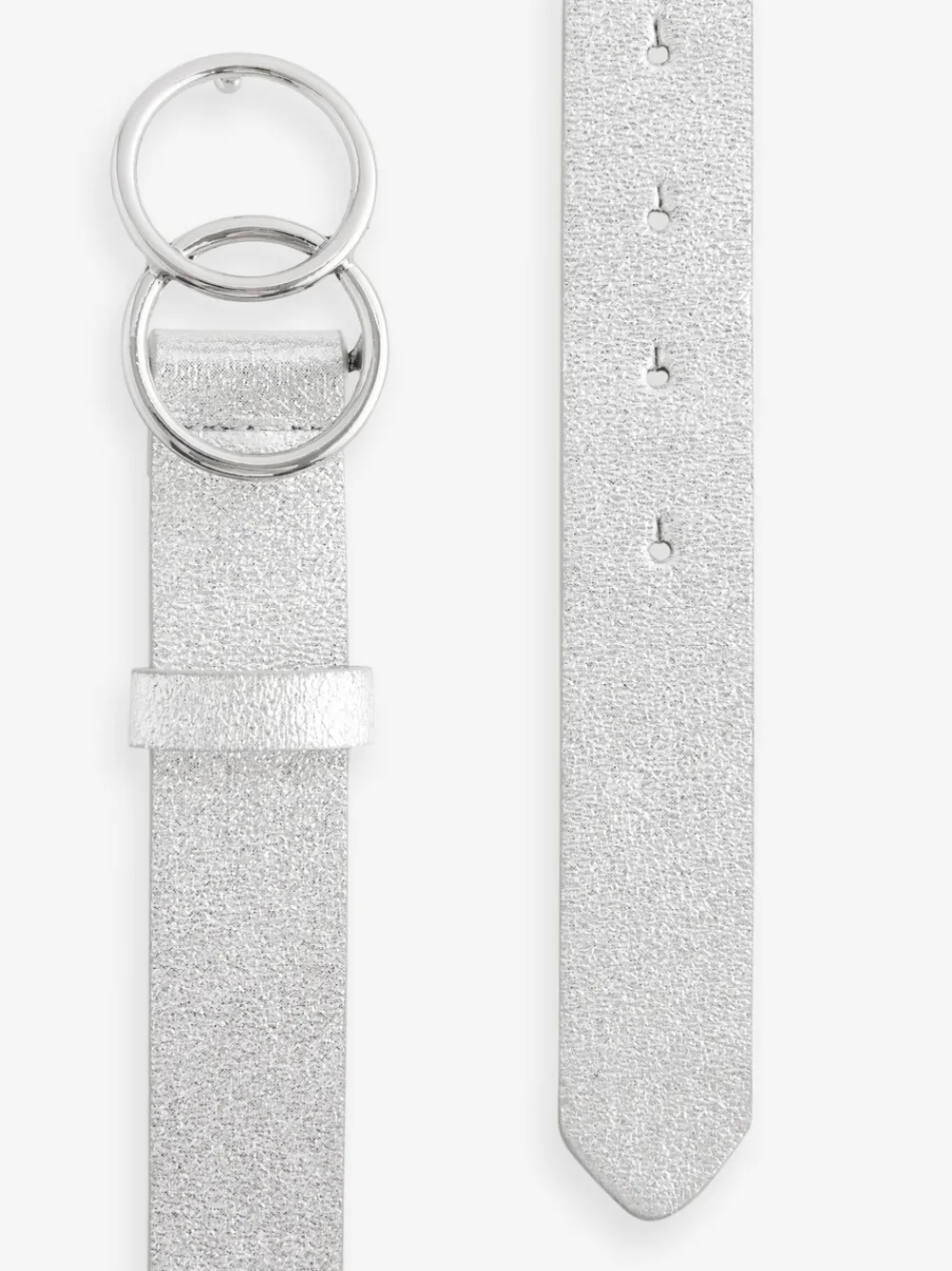 Maak een sprankelende statement met deze glitterende riem met dubbele cirkel en zilverkleurige gesp, voorzien van een imitatieleren band en een ton-sur-ton keeper-band. Combineer met je favoriete Jeans en bijpassende Schoenen voor een opvallende look. Kunstleren band Keeper-band Dubbele cirkelgesp Glittereffect 100% polyurethaan.