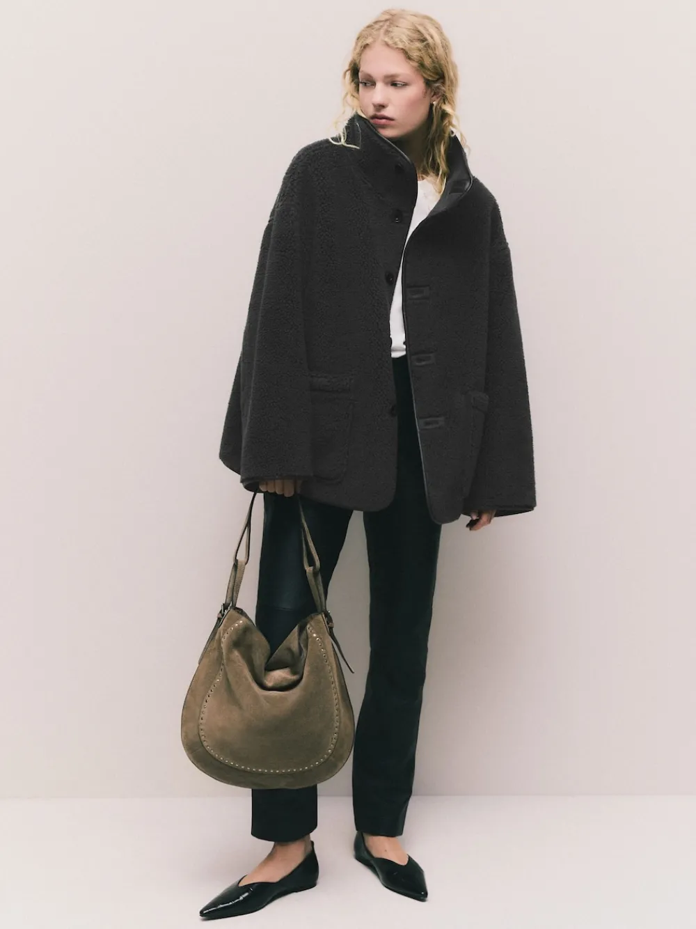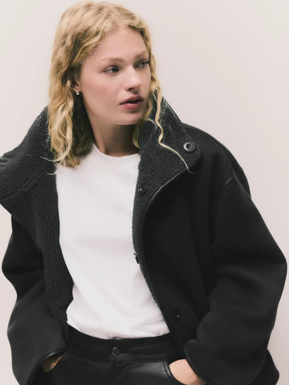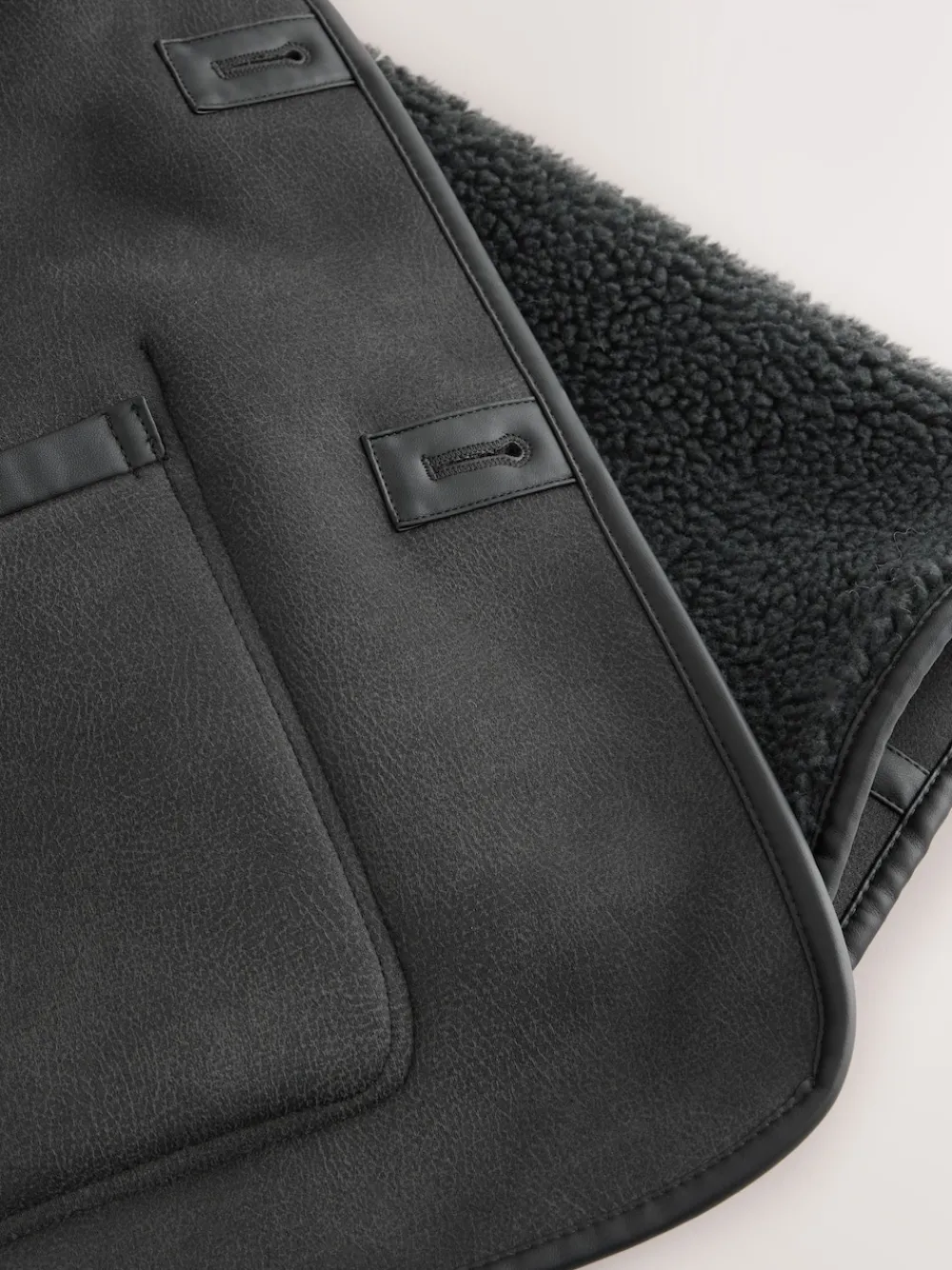 Maximise your wardrobe potential with this versatile reversible jacket. Featuring a cosy borg design on one side and a smooth suedette finish on the reverse, it offers a chic funnel neck and patch pockets. Perfect for stylish, changeable weather. Reversible design Borg fabric Funnel neck Button-up fastening Patch pockets Standaard van het midden van de nek tot de zoom 28.5″ / 72 cm. Machinewasbaar. 98% gerecycled polyester, 2% elastaan.