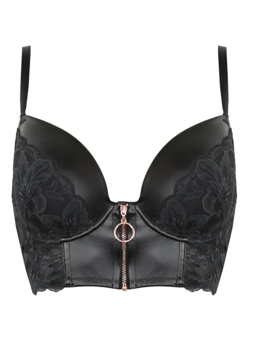 Wij hebben het perfecte Lingerie-stuk voor diegenen die zowel sexy als comfortabel willen zijn. Dankzij de beugelconstructie en het licht gewatteerde, diepe model heeft deze bh een Flatterend en ondersteunende pasvorm die uw Natuurlijk figuur accentueert. Het weelderige kant met contrasterende voering voegt een vleugje luxe toe, terwijl de zachte PU-imitatieleren panelen een opvallend contrast en een sensuele uitstraling creëren. De bandjes op de rug zijn volledig verstelbaar voor een comfortabele en veilige pasvorm. Deze sexy Lingerie is dus perfect om de hele dag te dragen. De unieke ritssluiting aan de voorkant zorgt voor extra veelzijdigheid, omdat u de tas zowel aan de voor- als achterkant kunt vastmaken. Of je hem nu draagt voor een speciale gelegenheid of gewoon om wat extra glamour toe te voegen aan je dagelijkse leven, de Onyx Zip Front Fastening Padded Longline Bra en bijpassende slip zijn de perfecte keuze. Alleen met de hand wassen. 59% Nylon, 33% polyester, 8% elasthaan.