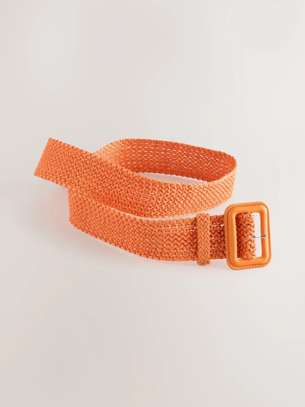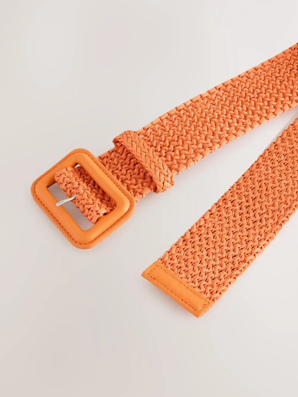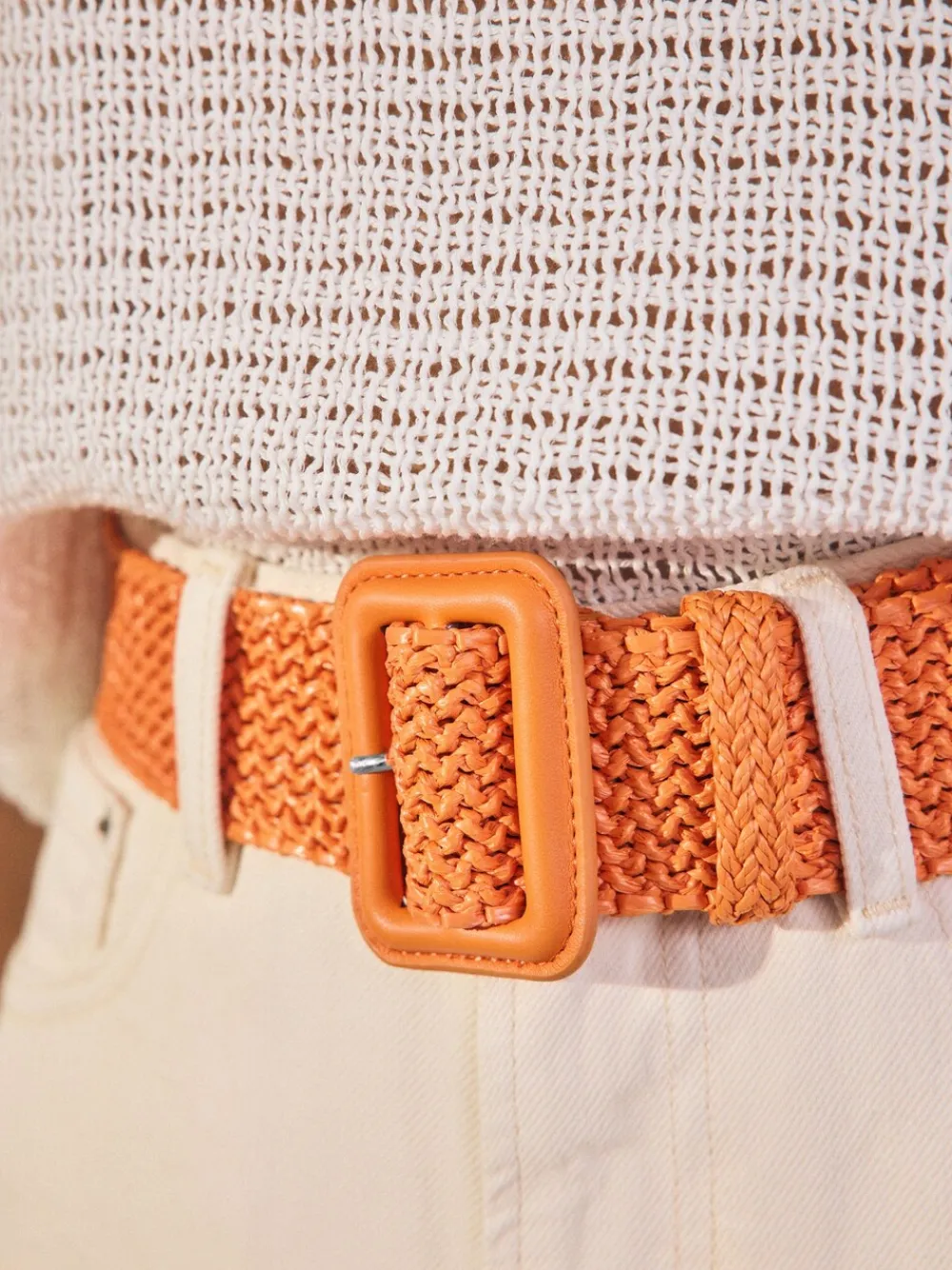 Voeg een vleugje kleur toe aan je zomeroutfit met deze brede geweven raffia riem in een feloranje kleur met vierkante gesp. Geweven raffia brede Keeper-band Hoofd 100% nog.. Rand 100% polyurethaan.