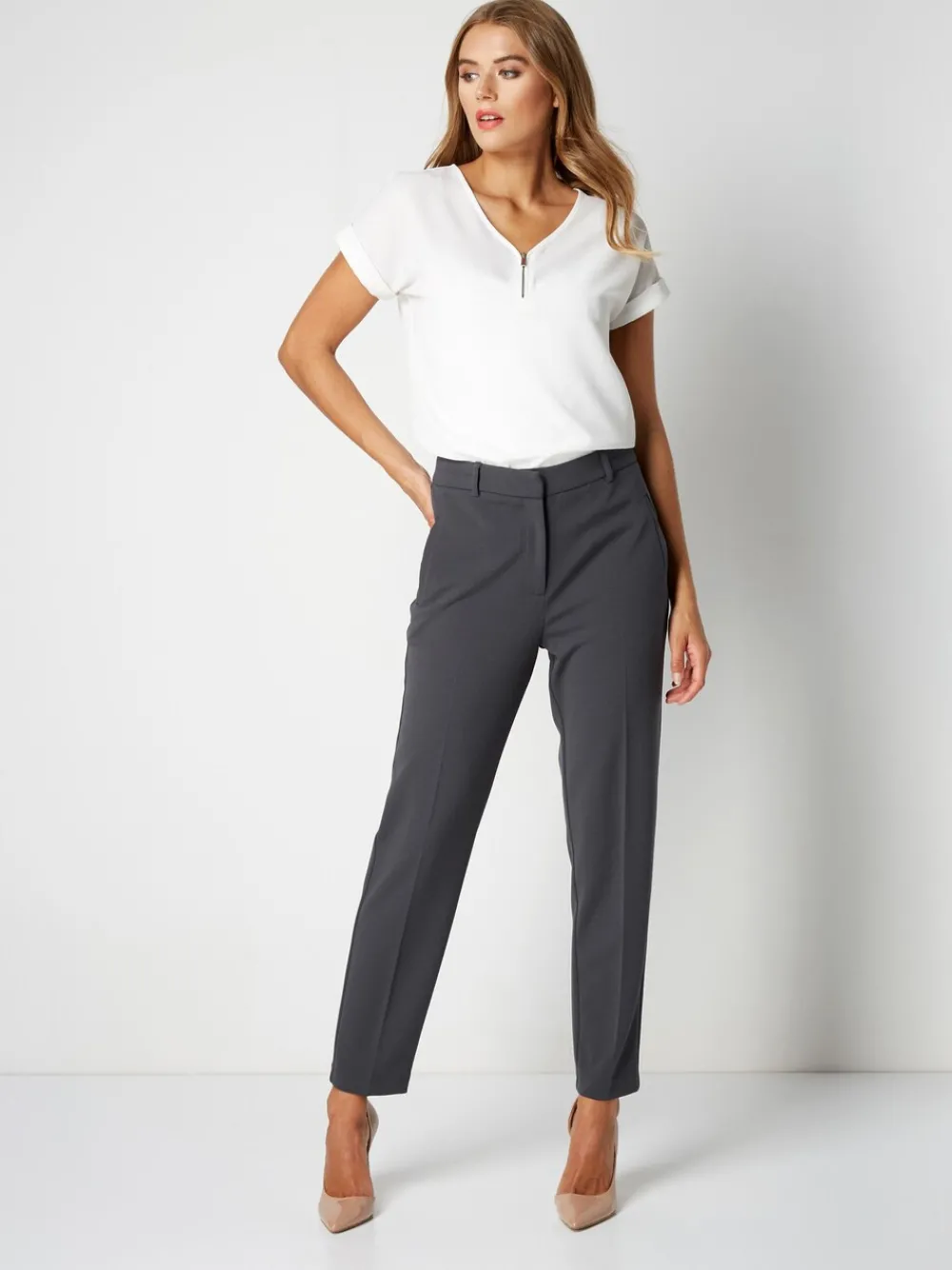 Met deze Tapered broeken met plooien aan de voorkant ziet u er altijd zakelijk uit. Deze basisstukken zijn onmisbaar in je garderobe en hebben twee schuine paspelzakken en een sluiting met rits en knoop. Deze zachte lentetint is ideaal voor van kantoor naar diner en als alternatief voor zwart. Hij staat geweldig met een ivoorkleurige blouse op kantoor. Mag gewassen worden. 96% polyester, 4% elastaan.