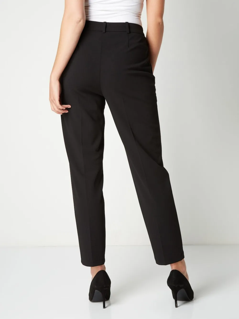 Always look the business in these pleat front tapered black trousers. Featuring two slanted welt pockets and button and zip fastening, these basic essentials are a wardrobe must-have. Ideal for desk-to-dinner wear and the perfect alternative to black, this soft springtime shade will look great with an ivory blouse in the office. 96% polyester, 4% elastaan.