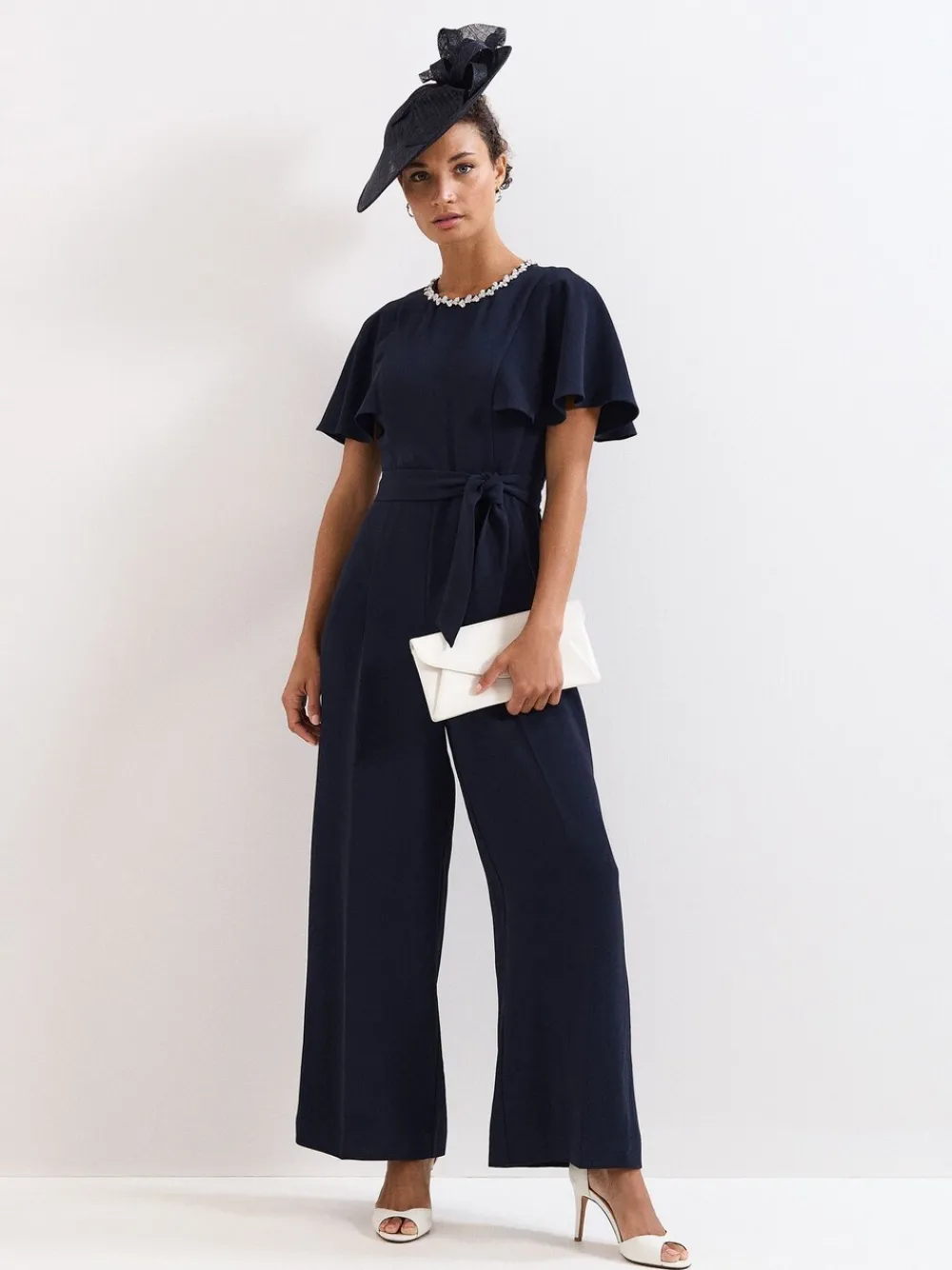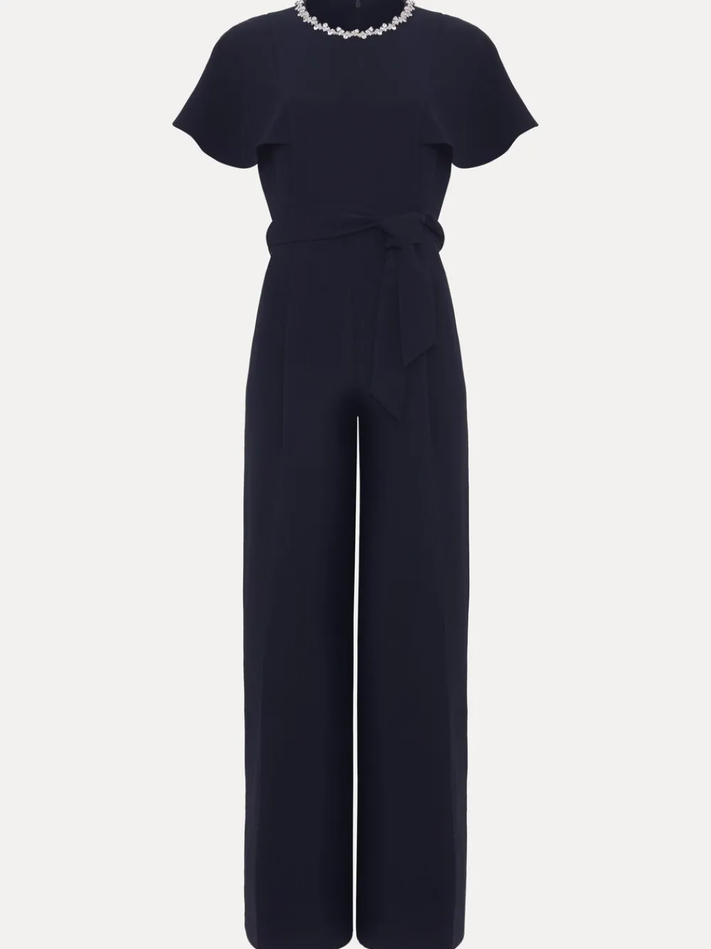 The ultimate definition of sophisticated event style. This navy jumpsuit is designed in a modern wide-leg silhouette, featuring gorgeous fluid sleeves and a tie waist for shape. The feature that makes this piece truly special is the feminine embellishment detail at the neckline that radiates elegance, making this the perfect style for all your upcoming events. Alleen chemisch reinigen. 100% polyester.