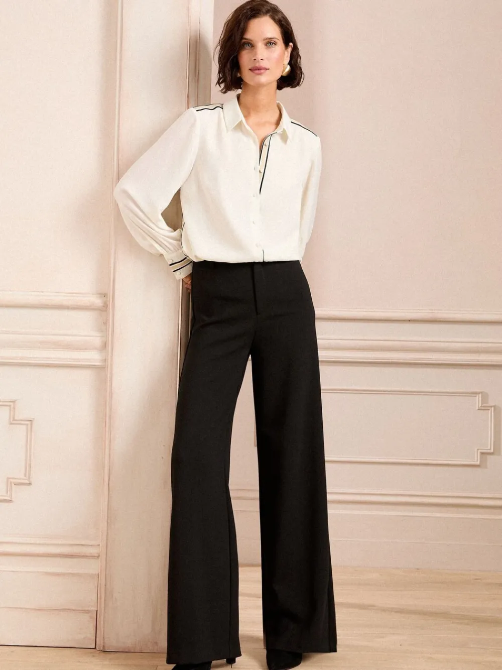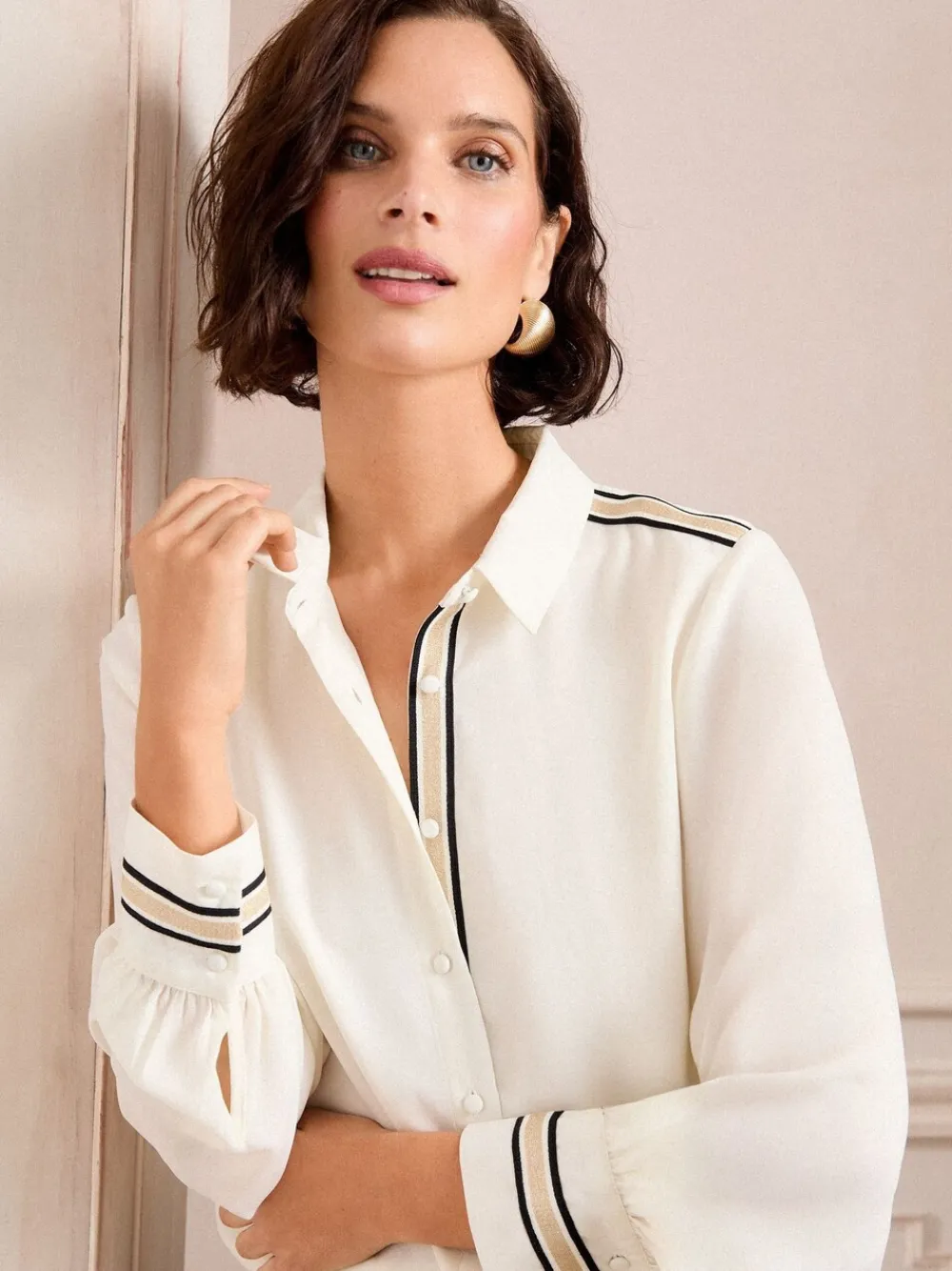 Elevate your casual and smart ensembles with the Love & Roses Button Through Long Sleeve Shirt. This perfect elevated shirt features a classic shirt collar and a full button-through front. The design is subtly enhanced by striking metallic stripe detailing on the shoulders and cuffs, adding a touch of golden gleam and luxury. With its soft drape and sophisticated accents, this long-sleeve blouse is ideal for effortlessly upgrading trousers or skirts. Metallic trim Long sleeve Button through Hoofdbestanddeel 100% polyester. Voering 100% polyester.