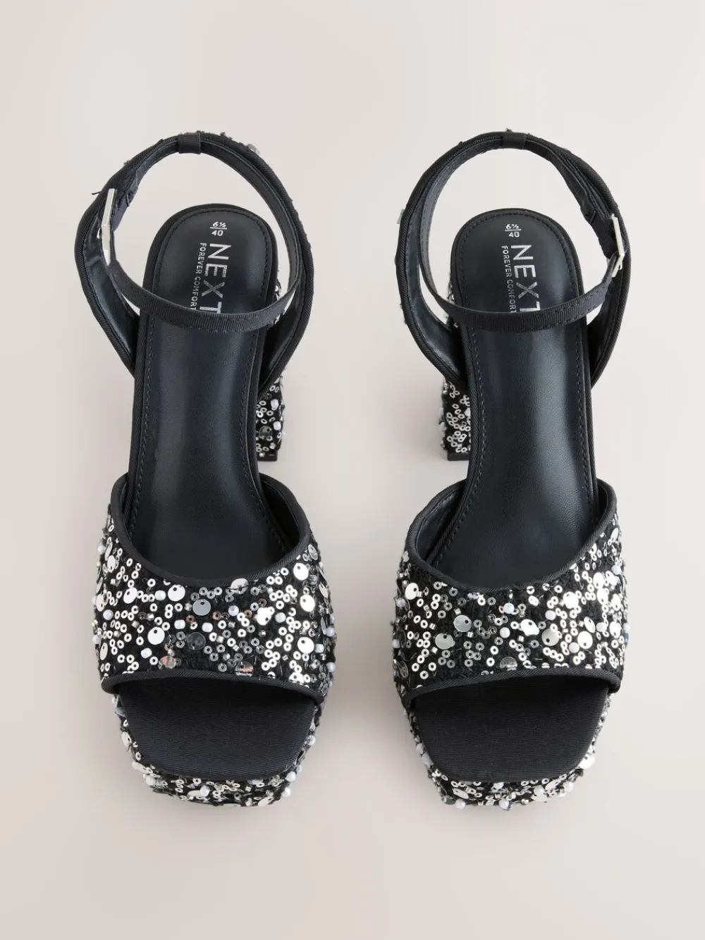 Dazzle with every step in these gorgeous sequin block heel sandals. Perfect for occasionwear, the all-over shimmering sequin upper adds total glitz. Featuring Forever Comfort® padding and a stable block heel with an adjustable strap, they ensure comfortable, show-stopping style all night. Forever Comfort® padding Sequin upper Block heel Square toe Adjustable strap Open toe Hakhoogte 10,5 cm. Bovenwerk – textiel; voering en voetbed – overige materialen, zool – Andere materialen.