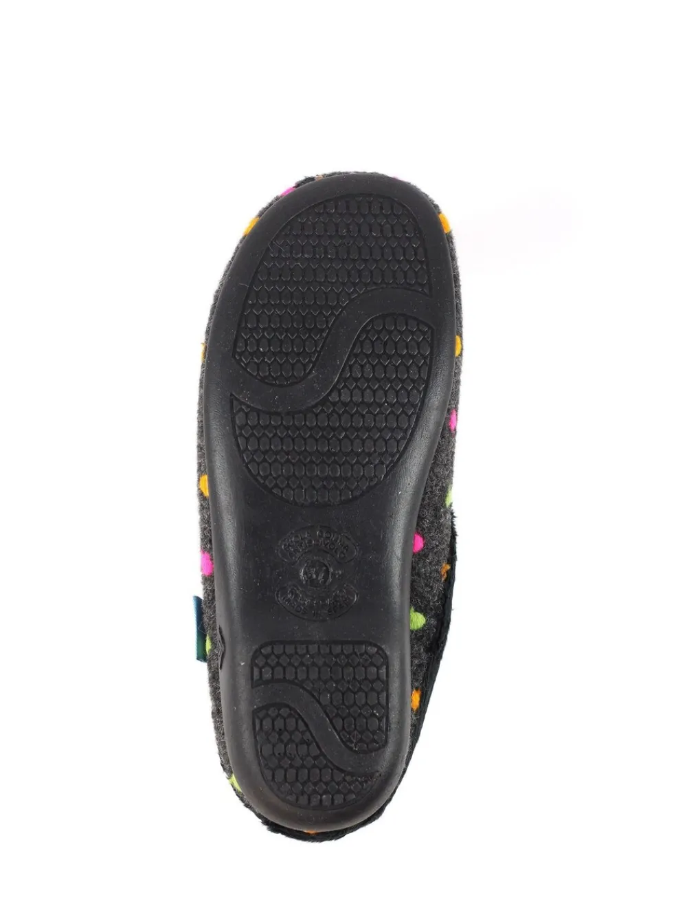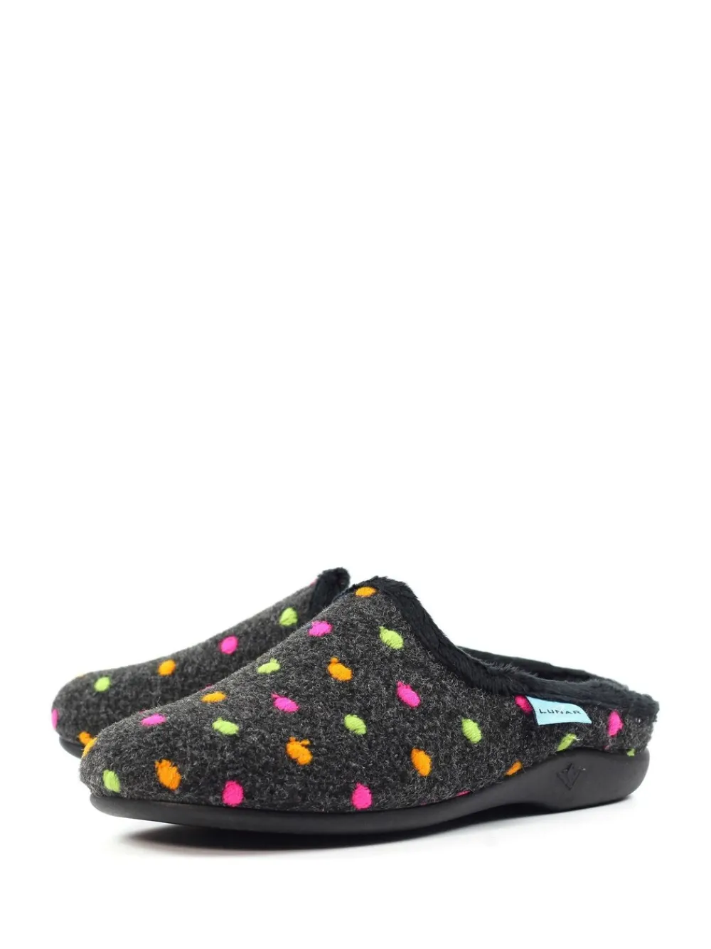 Introducing the Peanut mule slippers in black, where comfort meets style effortlessly. Crafted with a felt upper and lined with super soft fleece for luxurious warmth. Slip into relaxation with the easy mule design. Enjoy the padded insole with soft upper trims for added comfort. Decorated with a playful polka dot pattern, these slippers elevate your downtime in style. 100% andere vezels.