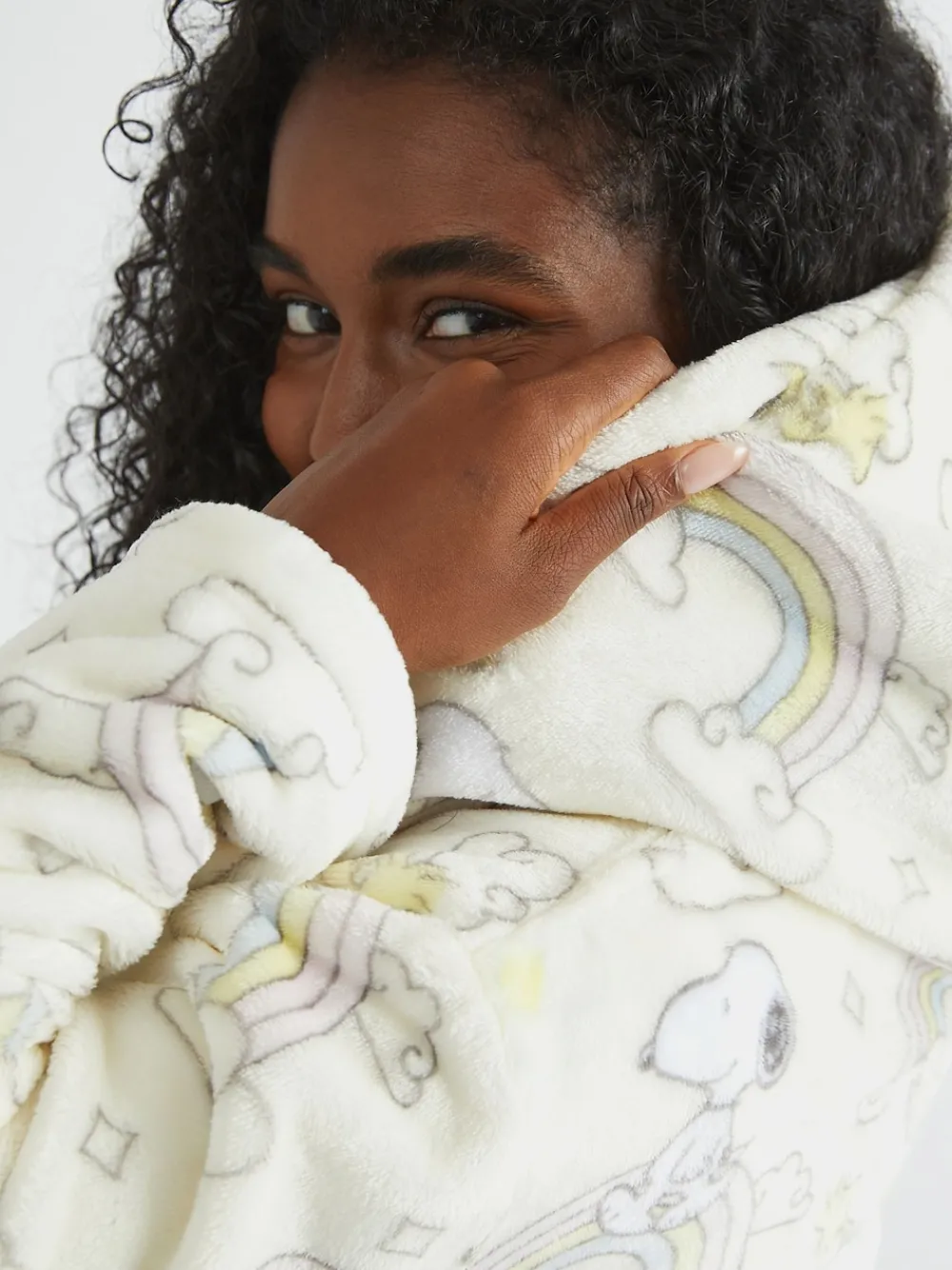 Brighten up your loungewear with the cheerful charm of Skinnydip Peanuts x Skinnydip Snoopy Rainbow Print Dressing Gown. 100% polyester.
