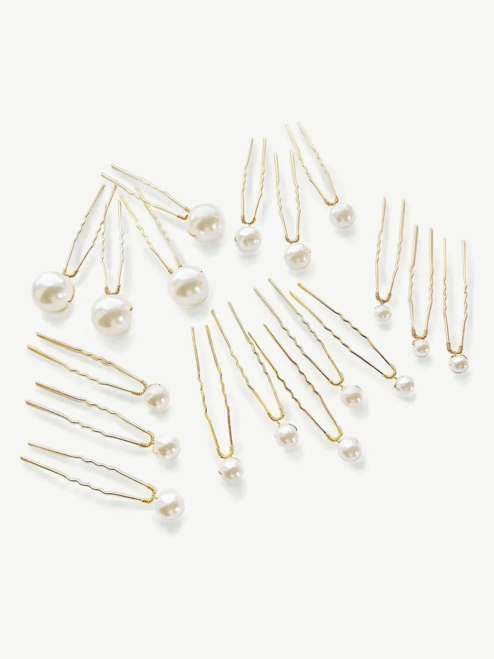 Prachtige en veelzijdige parelstyling. Een schitterende Set van 18 parelhaarspelden in oplopende maten, bezet met natuurlijke glanzende ivoorkleurige imitatieparels. Deze speldjes zijn veelzijdig en kunnen op allerlei manieren gedragen worden. De spelden worden geleverd als Set van 18 en zijn eenvoudig in bruidskapsels te schuiven. Door de vele speldjes in deze set is deze zeer waardevol. De set kan worden opgesplitst in groepjes van 1 voor de bruid en 1 voor de bruidsmeisjes. 75% Stone, 25% Brass.