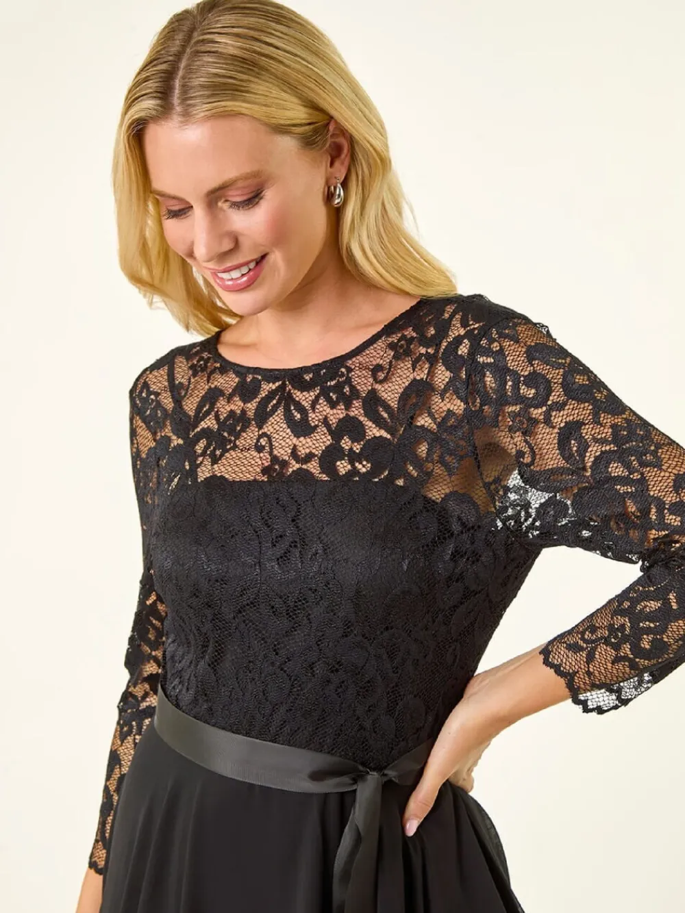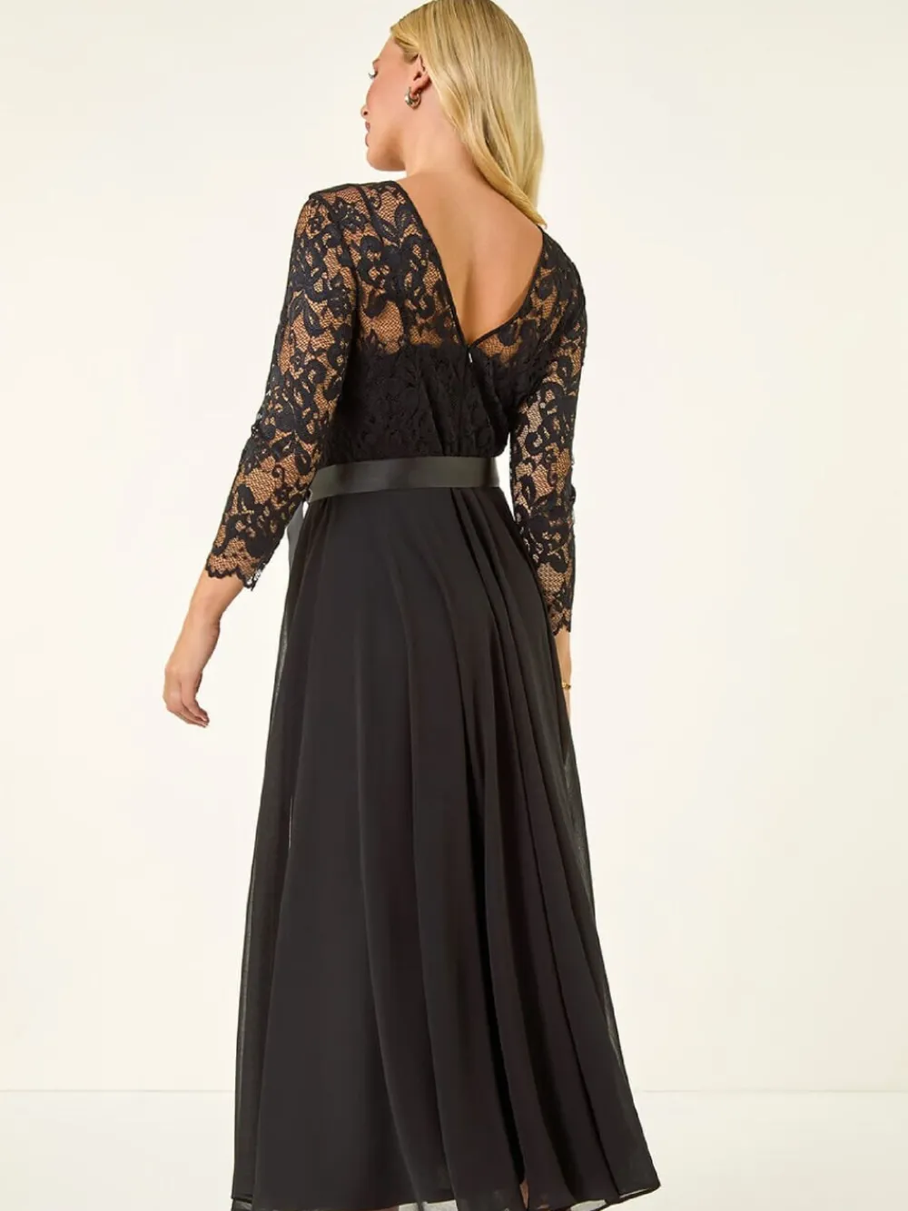 Add a touch of elegance to your wardrobe with this lace contrast dress. Featuring a classic round neck and chic 3/4 set-in sleeves, this dress combines a beautifully detailed lace bodice with a comfortable chiffon skirt for a sophisticated look. Lined for extra comfort, this midi-length dress is finished with a convenient zip fastening on the back. Complete the outfit with strappy heels and a tailored blazer for a polished ensemble. Standaardmaat van de zijkant van de nek tot de zoom 51″ / 129 cm. Machinewasbaar. 100% polyester.
