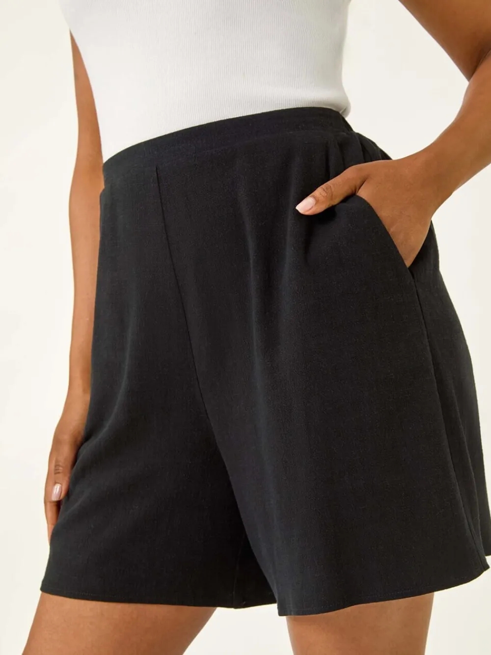 These Petite shorts feature an elasticated waistband and a pull on style for effortless wear. With angled side pockets and made from a comfortable woven linen mix fabric, they offer both style and practicality. Pair them with a cami top and sandals for a laid-back, summery look that s perfect for warm weather. Standaard binnenbeenlengte 6,5″/16 cm. Machinewasbaar. 87% viscose, 13% linnen.
