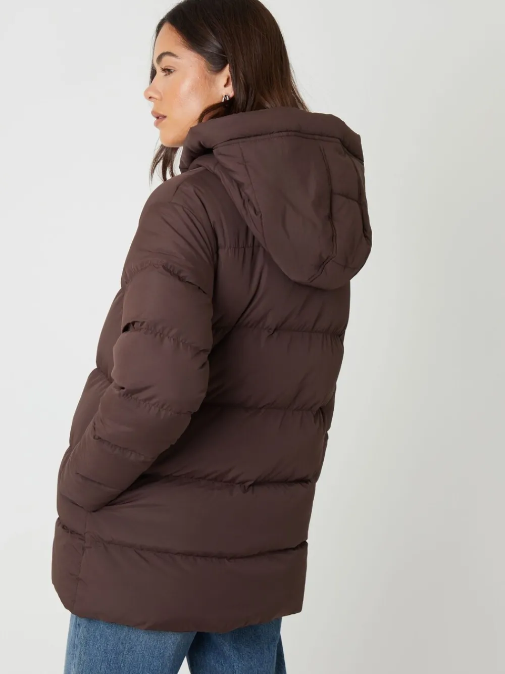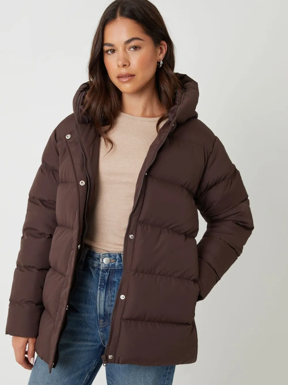 Keep snug yet stylish in our Threadbare puffer jacket. 3-piece padded hood with turn-back detail. Concealed full zip fastening with snap fasteners. Side seam pockets. Duvet hem and cuffs. Horizontal quilted padding. Mid-length. Petite. Model wears UK size. Machinewasbaar. 100% polyester.