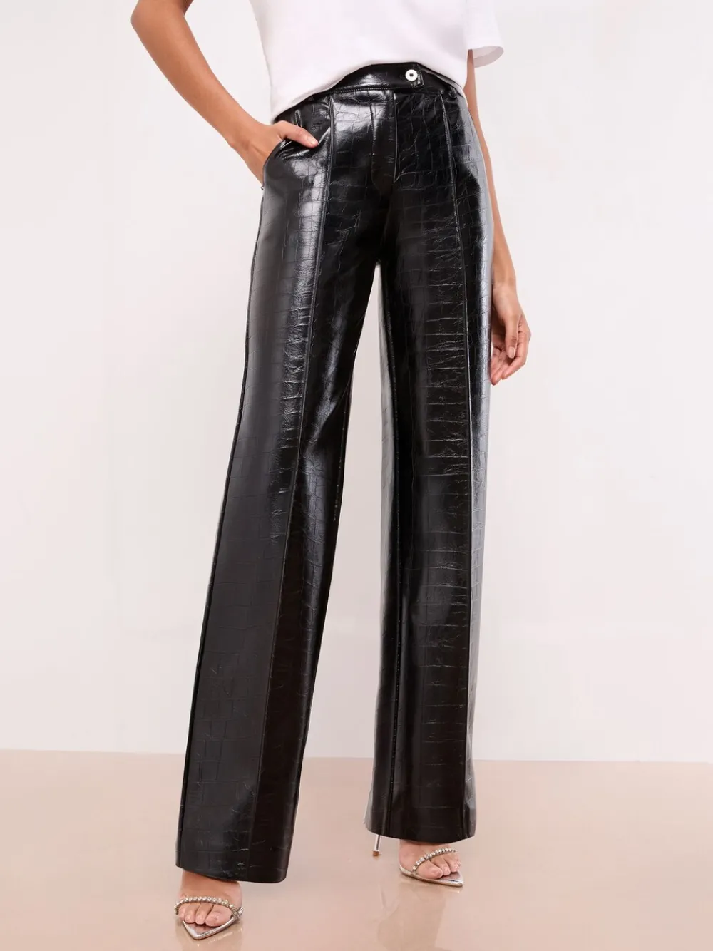 Make a bold statement with these Faux Leather Pintuck Tailored Wide Leg trousers. Combining edge and elegance, they feature sharp pintuck detailing and a sophisticated extended tab tailored waistband. The wide leg fit and functional back welt pocket detailing make these a trendy and comfortable option for a polished day-to-night look Faux leather fabric Pintuck detailing Wide leg fit Extended tab tailored waistband Back welt pocket detailing and front side pocket 100% polyester met PU-coating.