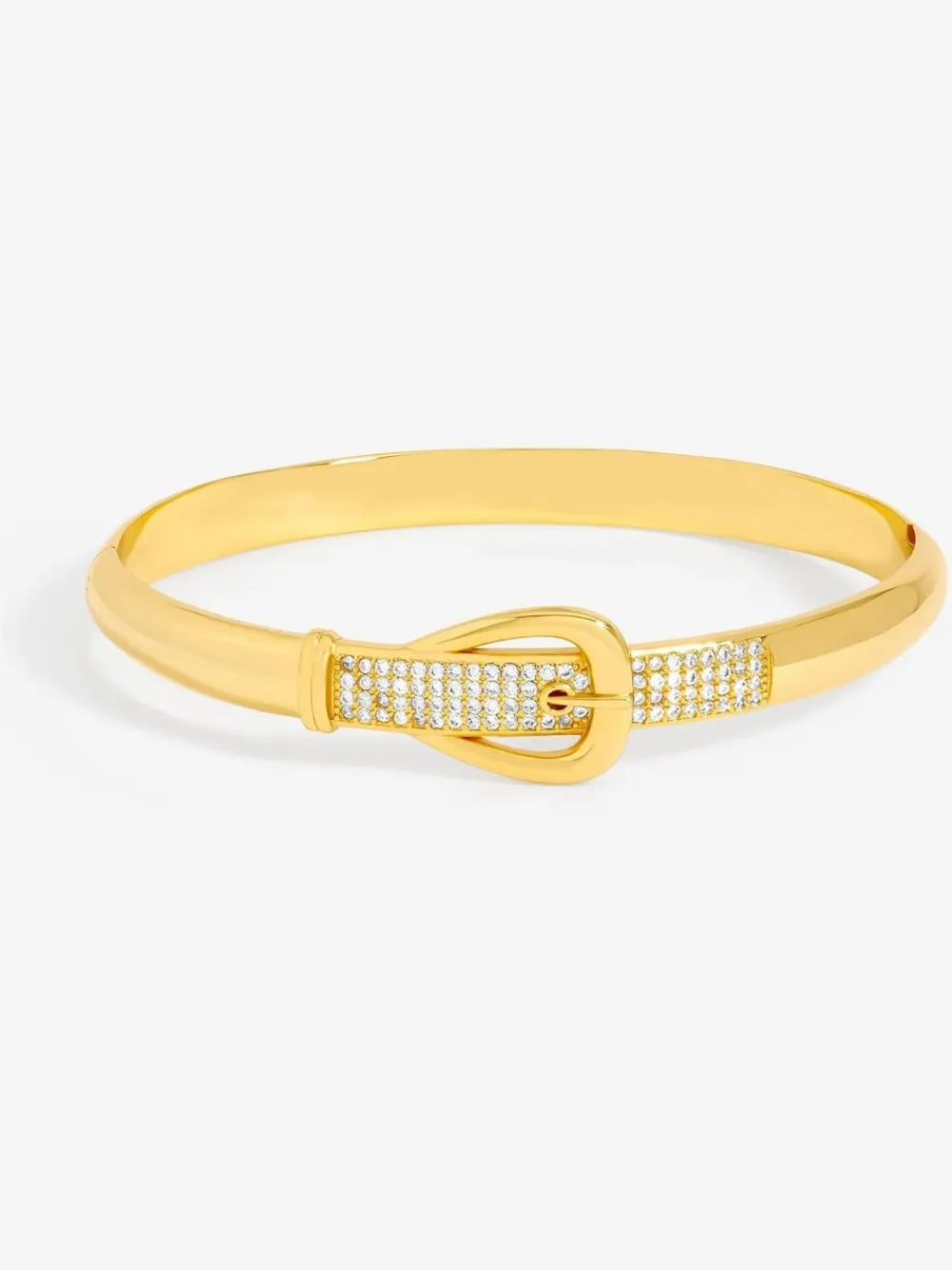 Our 18k Gold Plated and Pave Buckle Bangle is expertly finished, designed to bring bold elegance to your everyday style. Featuring striking pave Crystals made to sparkle and finished in rich 18k gold plating, this statement piece adds a touch of timeless sophistication. It’s the perfect addition to any jewellery collection. Fastening: Bangle. Width dimension: 13mm. Length dimension: 52mm. Material: 18K Gold Plated Base Metal. 100% messing.