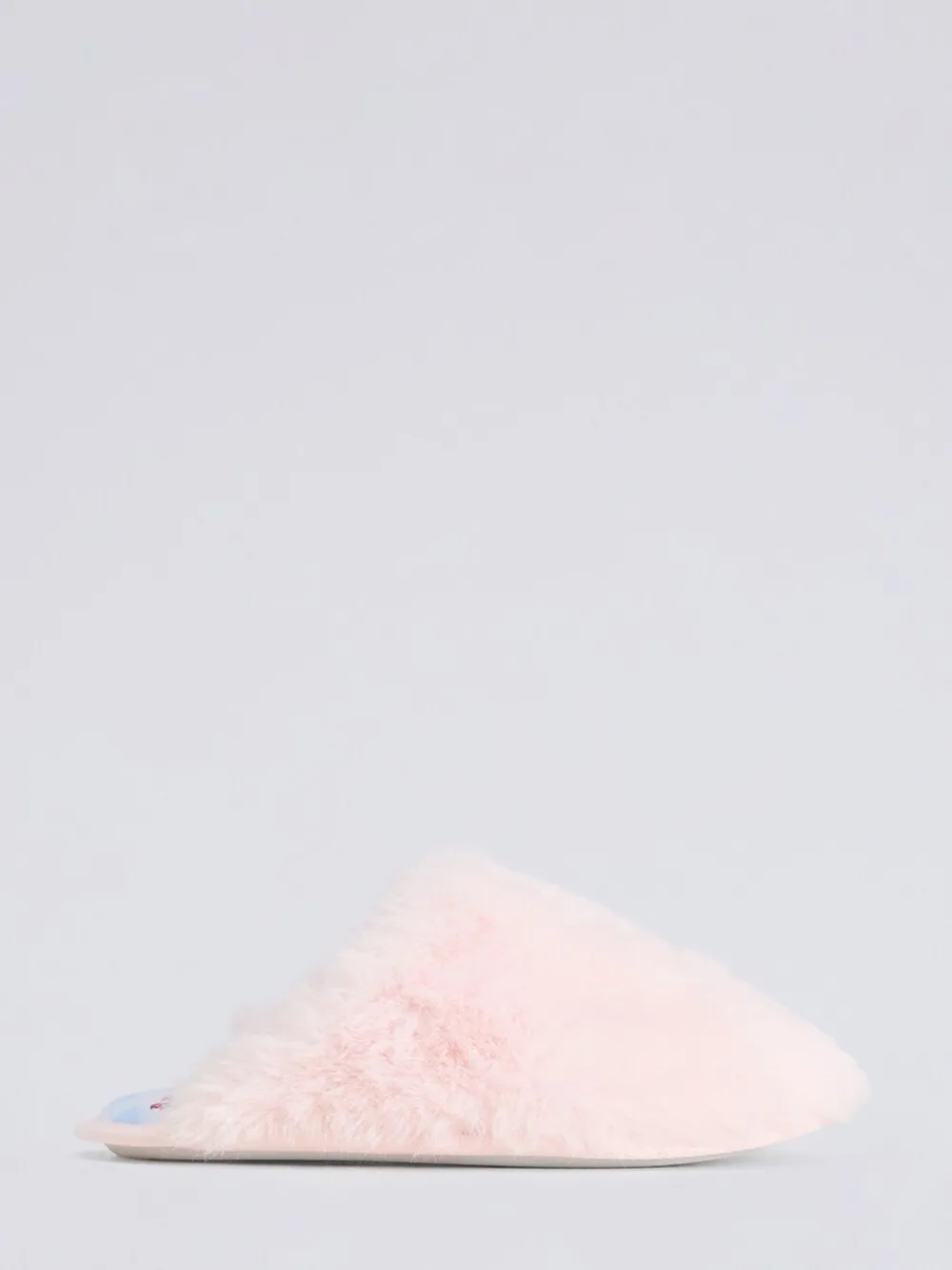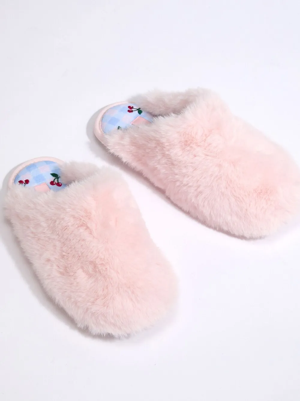 Lounge in style with our plush mule slippers, with the sweetest cherry embroidered sole! Mule slippers. Super soft pink plush fur. Blue gingham sole with cherry embroidery. Closed toe design. Complete the look with our pyjamas. 100% polyester.
