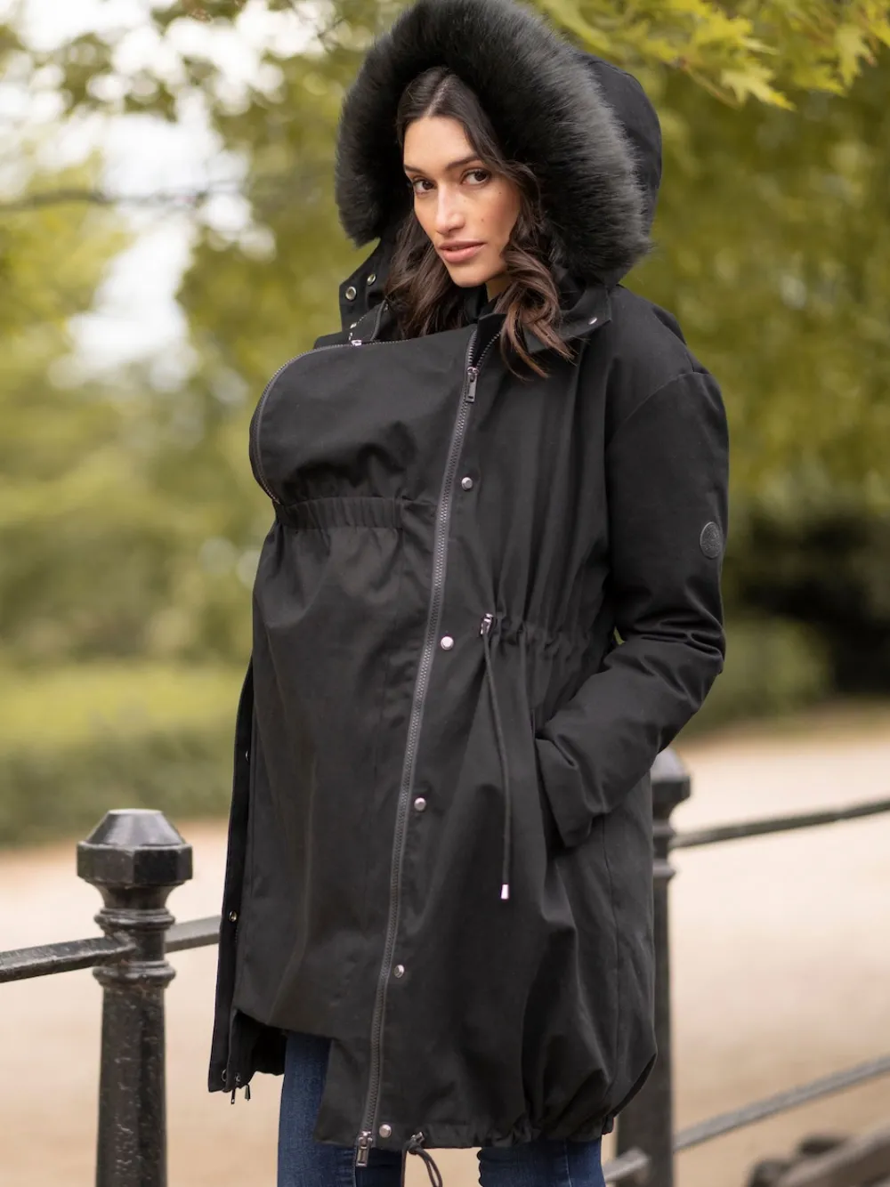 Zip-off kangaroo panel to wear with a baby sling Warmth level 4 – for extreme cold climates 100% cotton outer – wind & shower resistant Adjustable drawstring ties Hood with faux-fur trim Baby sling sold separately Machinewasbaar. Buitenkant 100% katoen. Voering 100% polyester. Vulling 100% polyester.