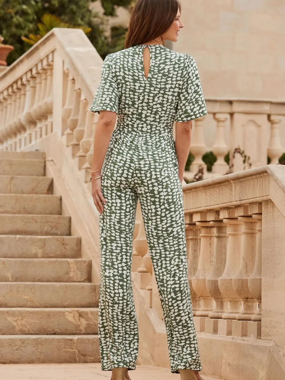 Geen enkele moeite vereist, zachte jerseystof valt als een droom, flatterend lijfje met V-hals omlijst door prachtige engelmouwen, geaccentueerd in de taille met een opvallende rotan riem, wijde pijpen: trendy en supercomfortabel, voeg alleen espadrilles toe. Binnenbeenlengte om te passen: kort 29 ‘ normaal 31 ‘ lang 33 ‘. Het model is 5 9 en draagt een UK maat 8 Machinewasbaar. 93% viscose, 7% elastaan.