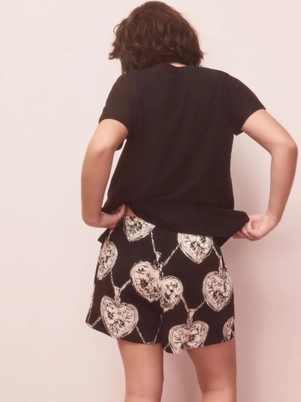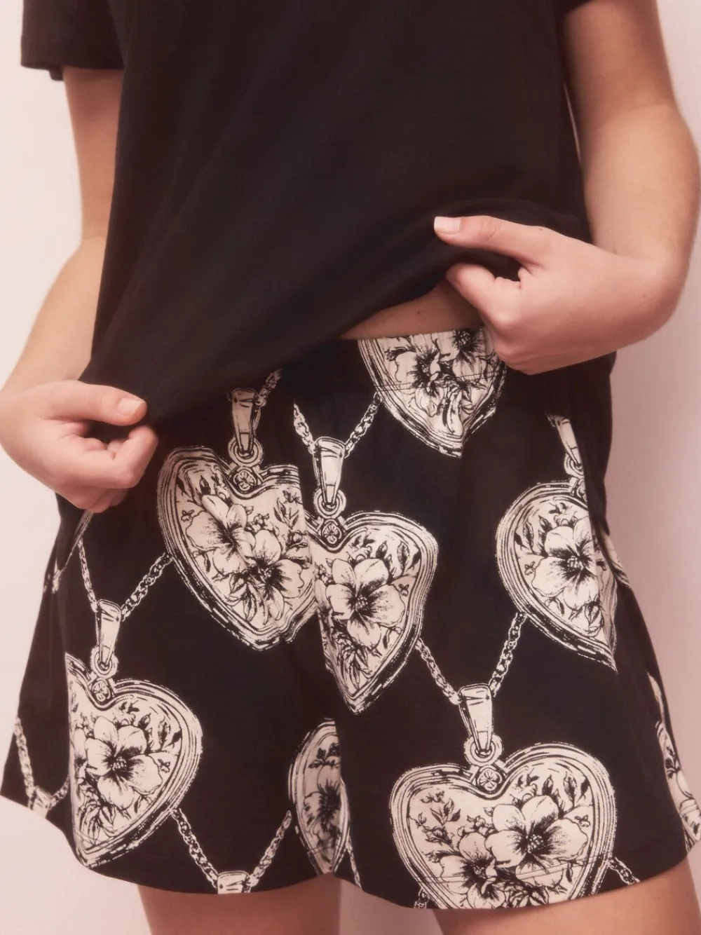 Get ready for a super soft and comfy night’s sleep in this short pyjama set. It pairs a plain black V-neck tee with printed shorts featuring a white heart motif, offering a relaxed fit. The perfect choice for easy bedtime style. Short sleeve V-neck top Heart print shorts Super soft and comfy Machinewasbaar. Pyjamatop en pyjamabroek 100% katoen. Waarschuwing: weg houden bij vuur en vlammen.