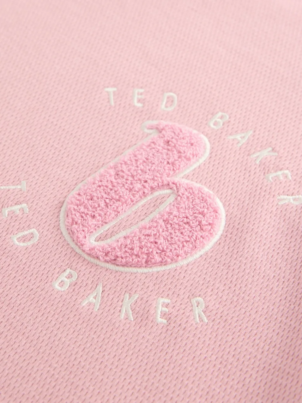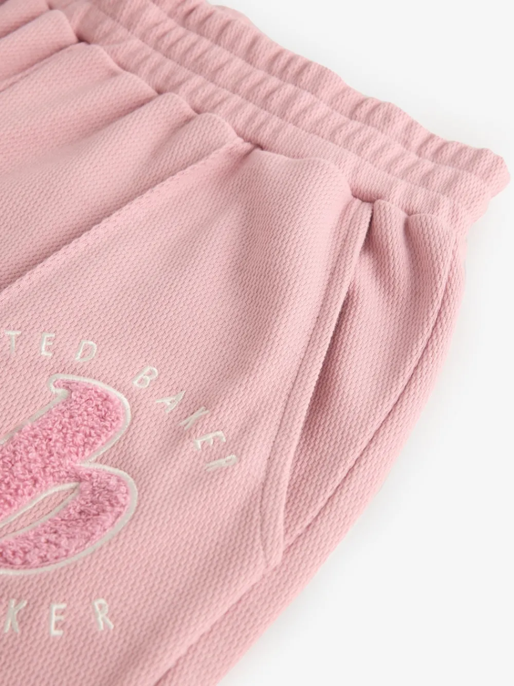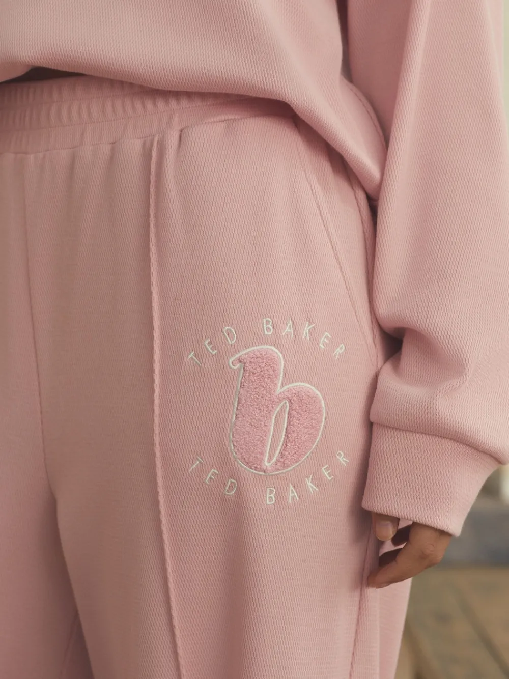 Unwind in ultimate comfort with the B by Ted Baker Pink Textured Wide Leg Boucle Embroidered Pyjamas Set. This slouchy and soft loungewear set is designed for a relaxed feel, featuring a beautiful soft pink shade. The top is finished with elegant boucle b branding and embroidery on the chest, while the wide-leg trousers have a comfortable elasticated waist, convenient pockets, and matching embroidery to complete the set. 2 piece set Branded embroidery Wide leg Machinewasbaar. Pyjamatop en pyjamabroek van 60% katoen, 40% gerecycled polyester.