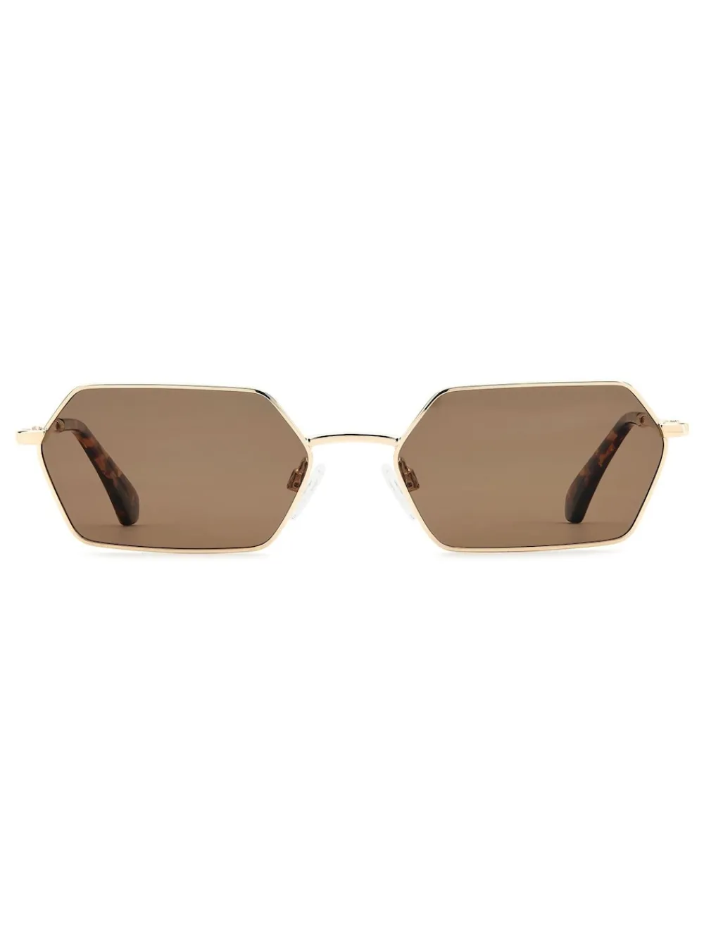 Turn heads with these ultra-stylish hexagonal sunglasses, featuring a sleek gold metal frame and warm brown-tinted lenses for standout sophistication. Designed for trendsetters, they offer full UV protection and all-day comfort with tortoiseshell-accented temples. Whether you’re dressing up or keeping it casual, these sunglasses are your go-to accessory for instant impact. 100% metaal.