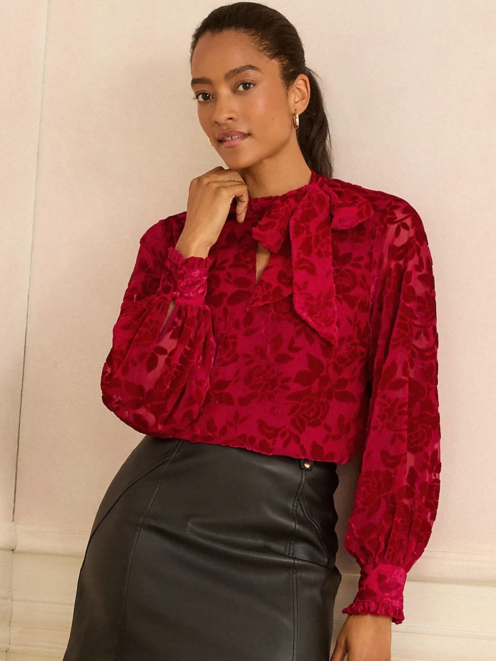 Rode fluweel Devoré – blouse met lange mouwen en striksluiting*Love & Roses Discount