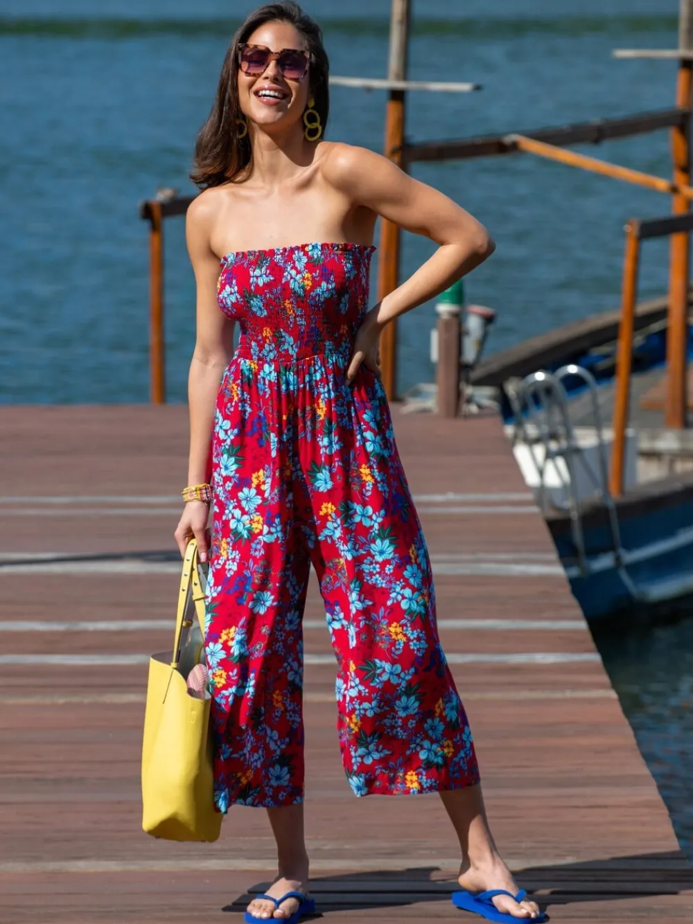 Voor een moeiteloze outfit voor uw volgende uitstapje hoeft u niet verder te zoeken dan de Rood Strapless Shirred Bodice Crop Leg Beach Jumpsuit. Deze jumpsuit met cropped pijpen heeft een strapless design en een comfortabel en flatterend gerimpeld lijfje. De jumpsuit is gemaakt van lichtgewicht, geweven materiaal dat zowel ademend als flatterend is. Of je nu naar het strand gaat of een dagje gaat wandelen, deze ondersteunende en flatterende strandjumpsuit is dé perfecte keuze voor een relaxte, maar stijlvolle zomerlook. Machinewasbaar. Upper 100% Viscose. Sole 100% EVA.