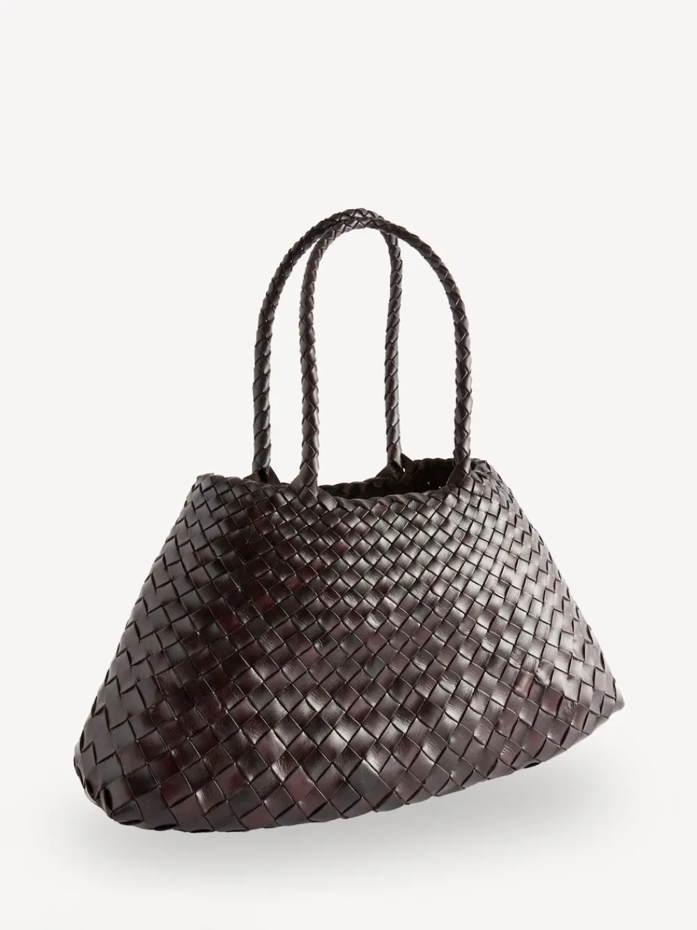 Crafted by expert weavers, the Santa Croce Big Bag in dark brown by Dragon Diffusion is revered by bag lovers everywhere. A striking cross-weave tapers towards the brim creating a statement silhouette. Handcrafted bag Cross-weave design Tapered to brim Unlined Hoogte 44 cm Breedte 23 cm Diepte 14 cm 100% leer.
