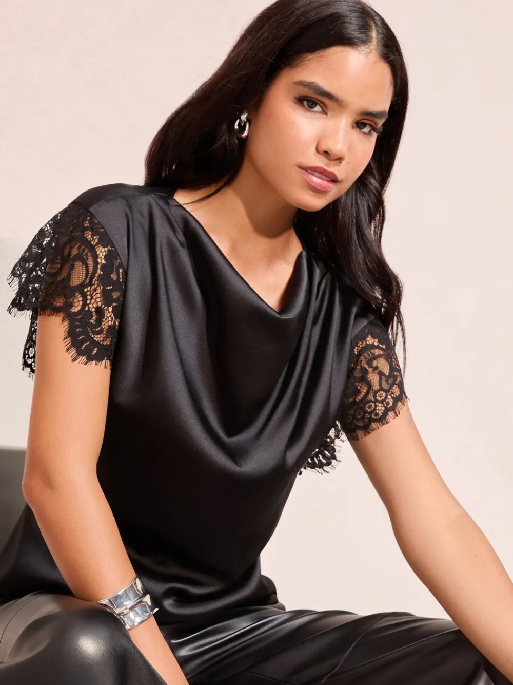 – satijnen blouse met kanten detail en watervalhals*Friends Like These Best
