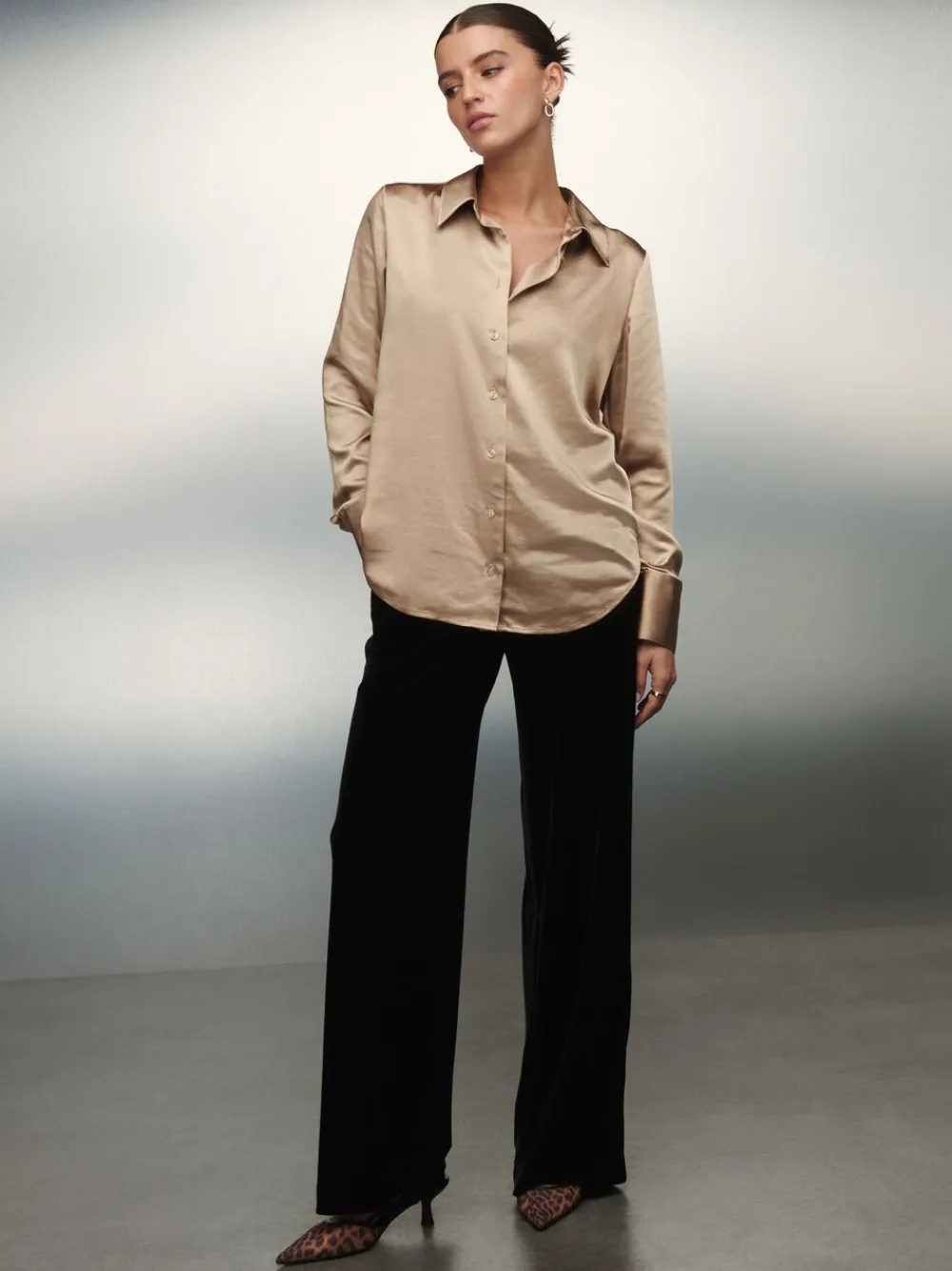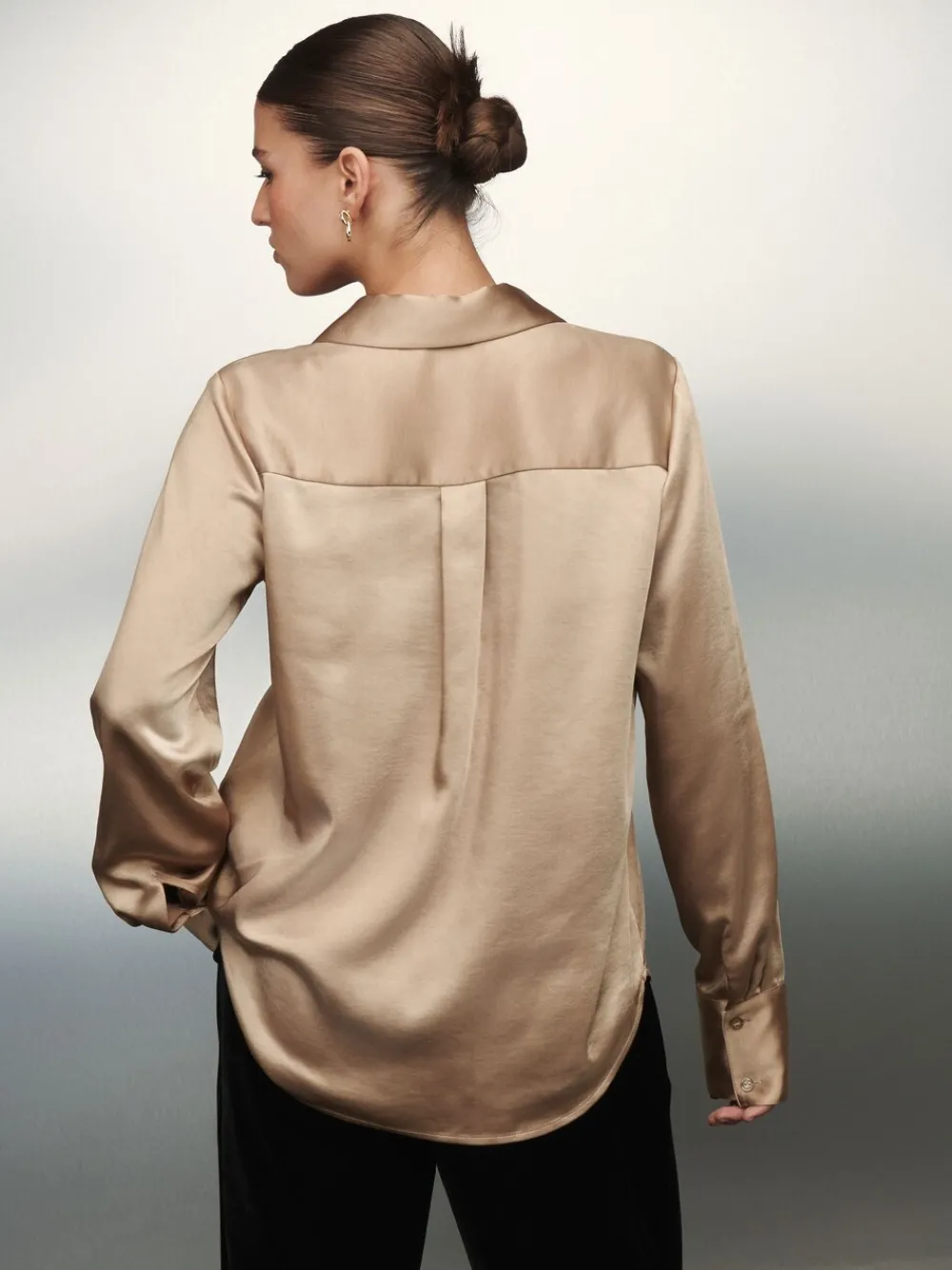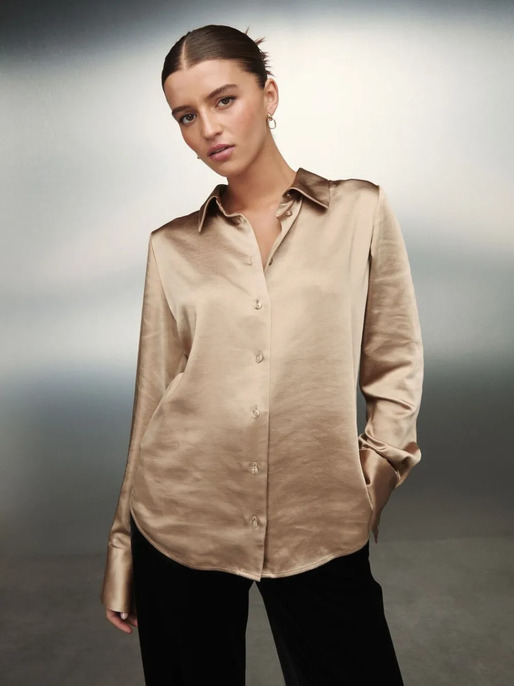Met dit chique overhemd met lange mouwen kun je moeiteloos van je bureau naar een etentje gaan. De gladde Satijn stof zorgt voor een verfijnde look, terwijl de knoopsluiting aan de voorkant en de mouwen met manchetten een tijdloos en veelzijdig silhouet bieden voor elke gelegenheid. Kraag Lange mouwen met manchetten Knoopsluiting aan de voorkant Machinewasbaar. 100% gerecycled polyester. Artikelen met het curve-logo zijn verkrijgbaar in de maten 18 en groter.