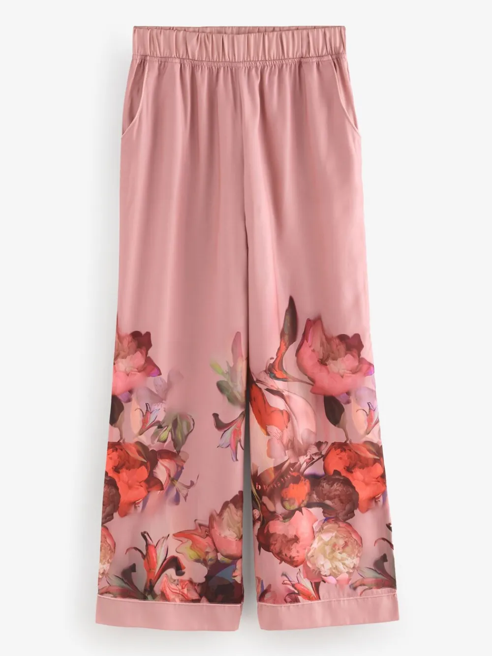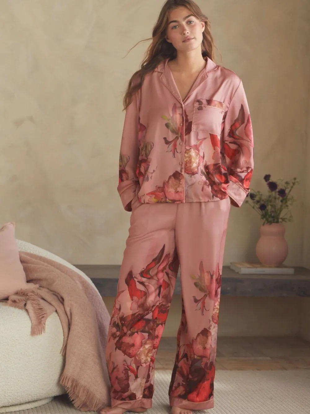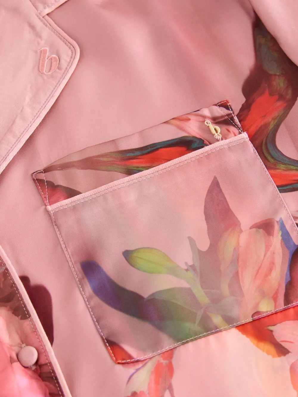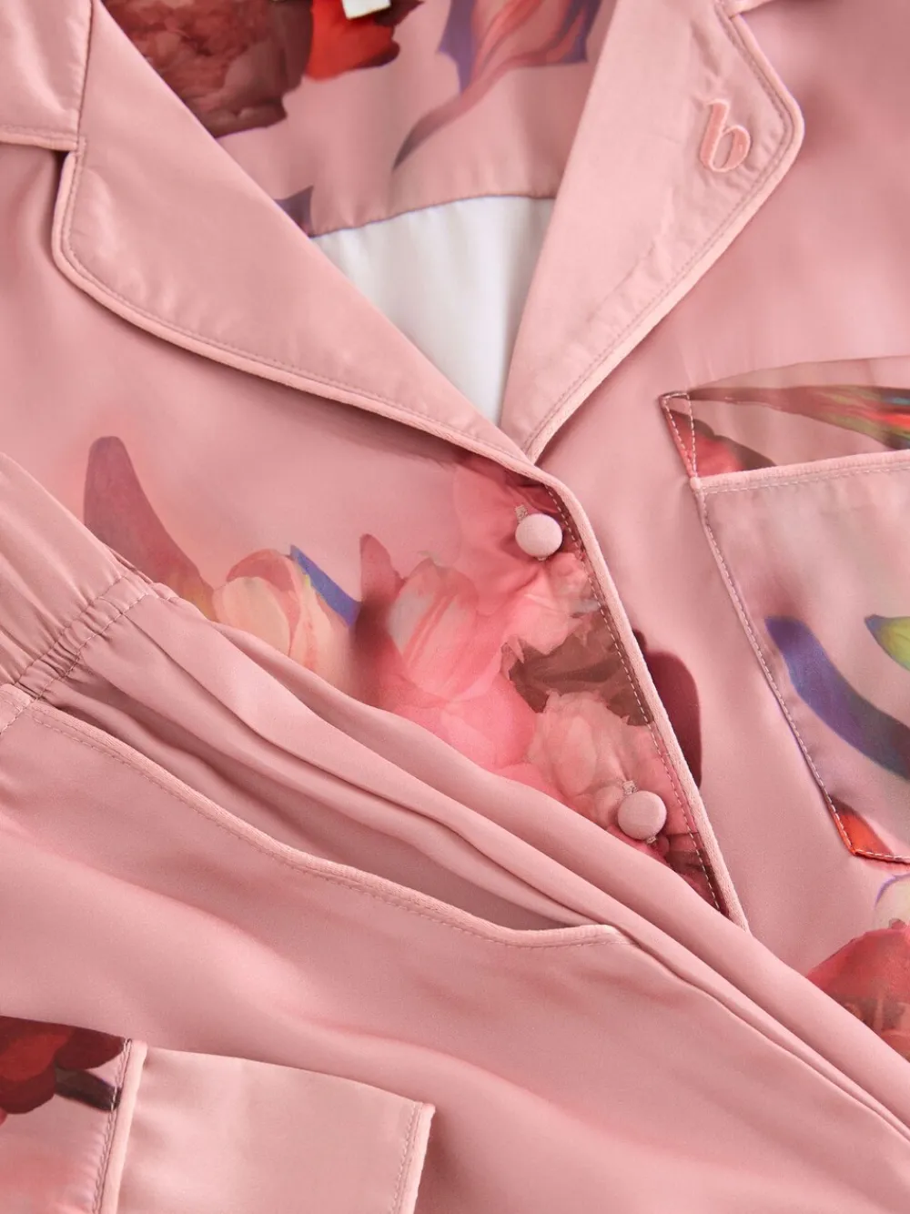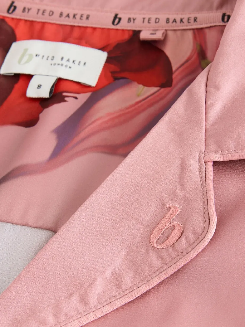 Drift off to sleep in style with the B by Ted Baker Satin Button Through Pyjamas. This luxurious set features a beautiful floral placement print that adds a touch of elegance. The button-through top has long sleeves and is accented with classic piped detailing and a chest pocket for a refined look. The collar is finished with delicate b embroidery, adding a subtle touch of signature branding. 2 piece set Soft satin Button through Machinewasbaar. Pyjamatop en pyjamabroek van 100% polyester.