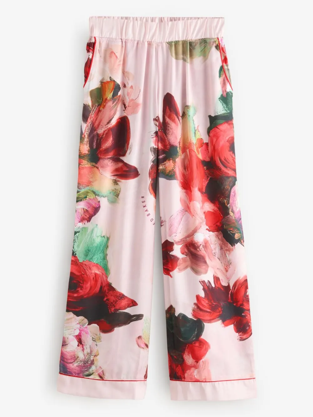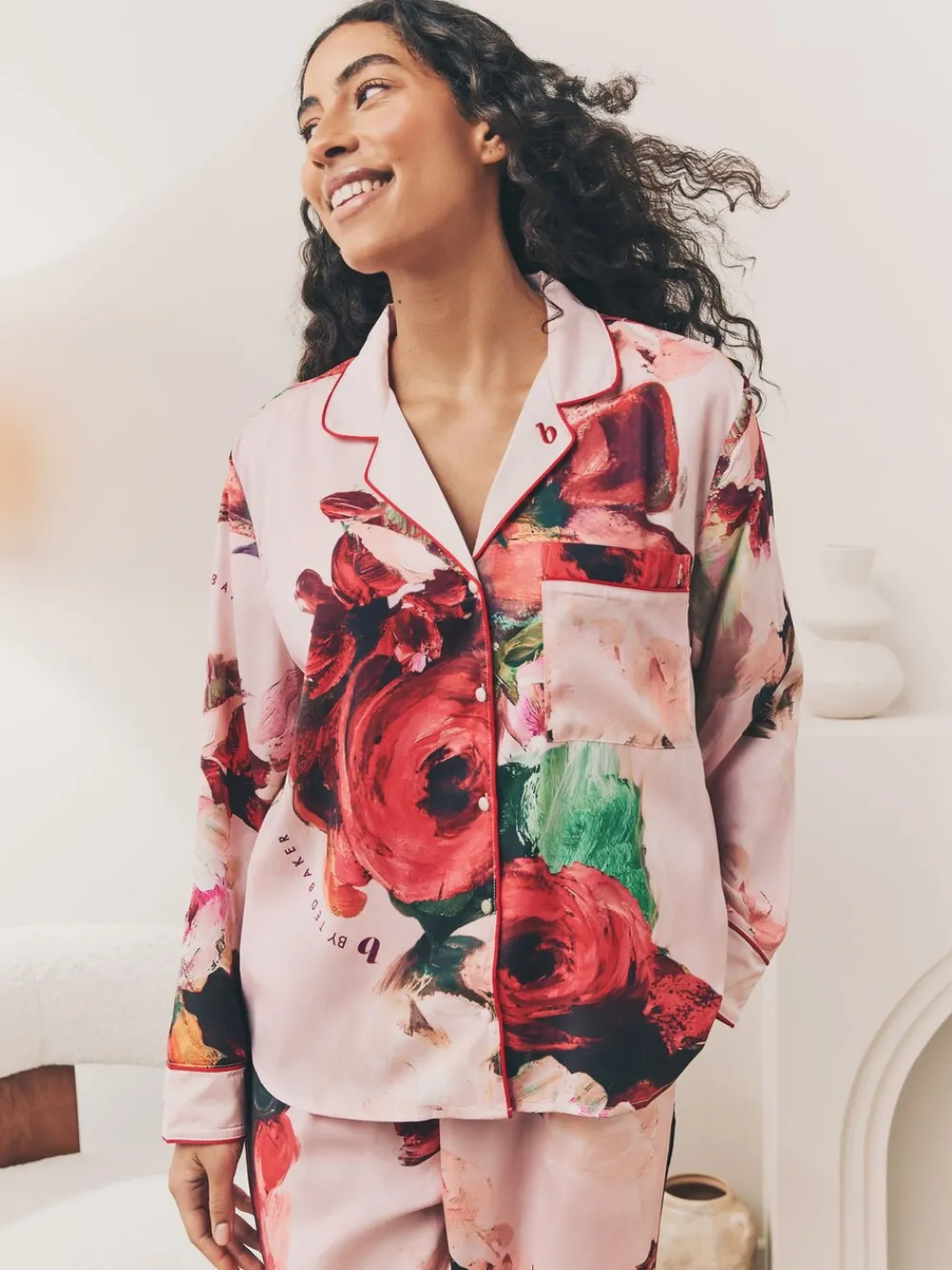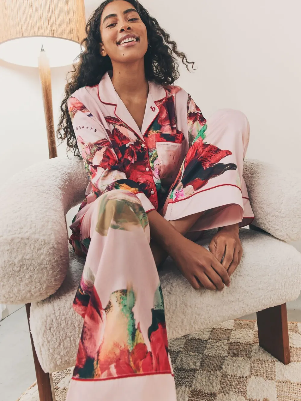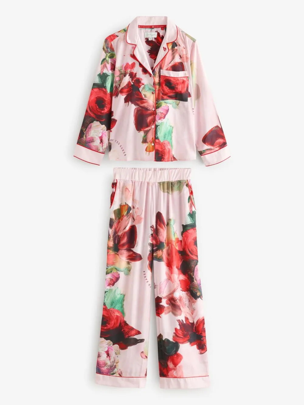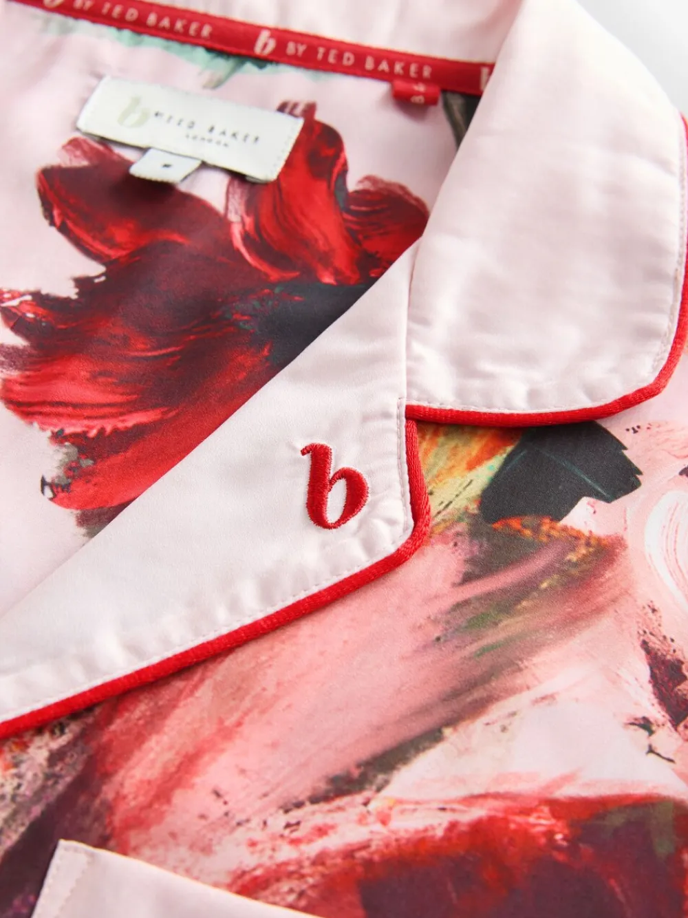 Drift off in luxurious comfort with the B by Ted Baker Satin Button Through Pyjamas Set. This elegant sleepwear set features a sophisticated and beautiful floral print, combining style with ultimate comfort. The top is designed with long sleeves and a classic button-through front, complete with a practical chest pocket. It’s perfectly paired with matching wide-leg trousers, featuring a comfortable elasticated waist for a relaxed fit. Enhanced with subtle gold branded hardware detailing and contrast piping, adding a touch of Ted Baker’s signature refinement to your nightwear collection. 2 piece set Floral print Branded hardware detail Machinewasbaar. Pyjamatop en pyjamabroek van 100% polyester.