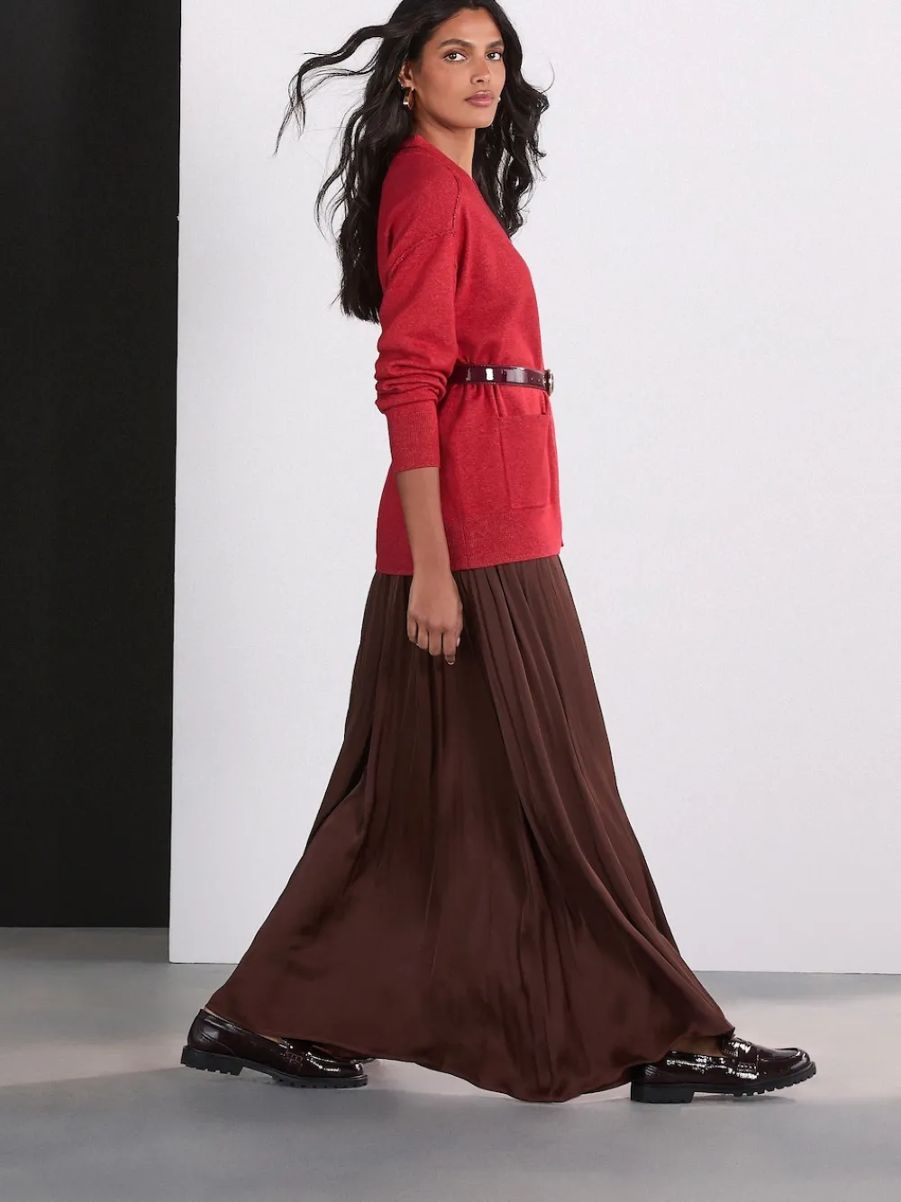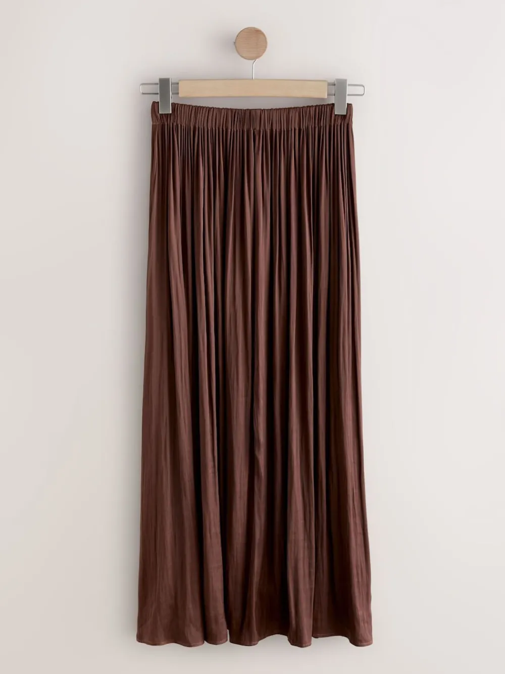 Make a bold statement in this fluid satin chocolate brown maxi skirt. Crafted from a gorgeous glossy satin fabric, it features soft pleating for dramatic movement. The comfortable pull-on elasticated waist ensures an easy, flattering fit, perfect for dressing up or down. Glossy satin fabric Comfortable pull-on elasticated waist Chic maxi length Machinewasbaar. 100% gerecycled polyester. Artikelen met het curve-logo zijn verkrijgbaar in de maten 18 en groter.