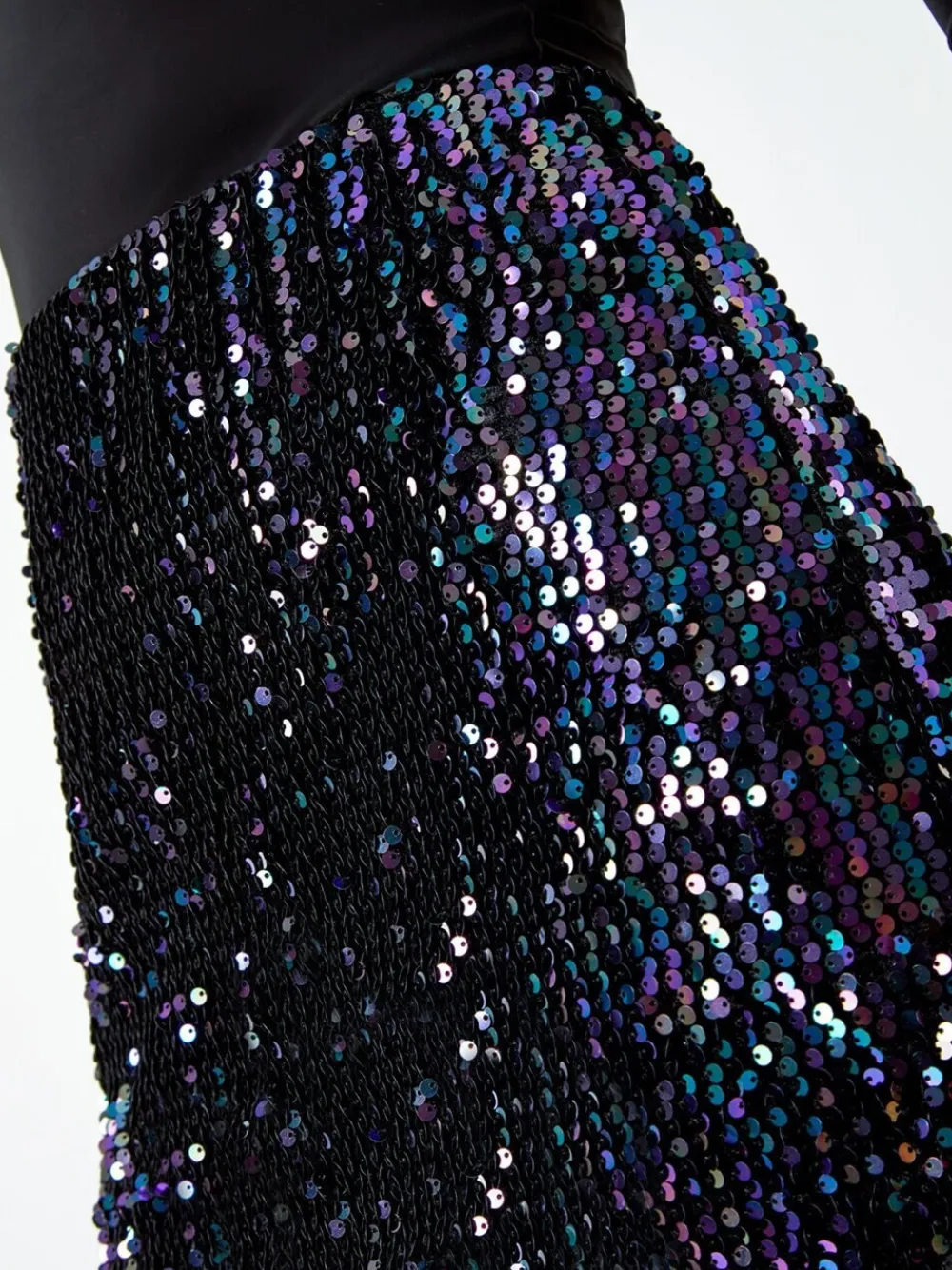 Be the star of the show this season with this sequin embellished, pencil skirt! The perfect party piece for the festive season ahead, this skirt is guaranteed to make a sparkling fashion statement. This velour piece is easy to pull on with a comfortable elasticated waist and soft inner lining. Cut from a soft stretch velour fabric and finishing just above the knee, this piece is designed in a fitted pencil shape. Pair with a satin shirt with heels to complete the look! Standaard van tailleband tot zoom 21,5″ / 54 cm. Machinewasbaar. 95% polyester, 5% elastaan.