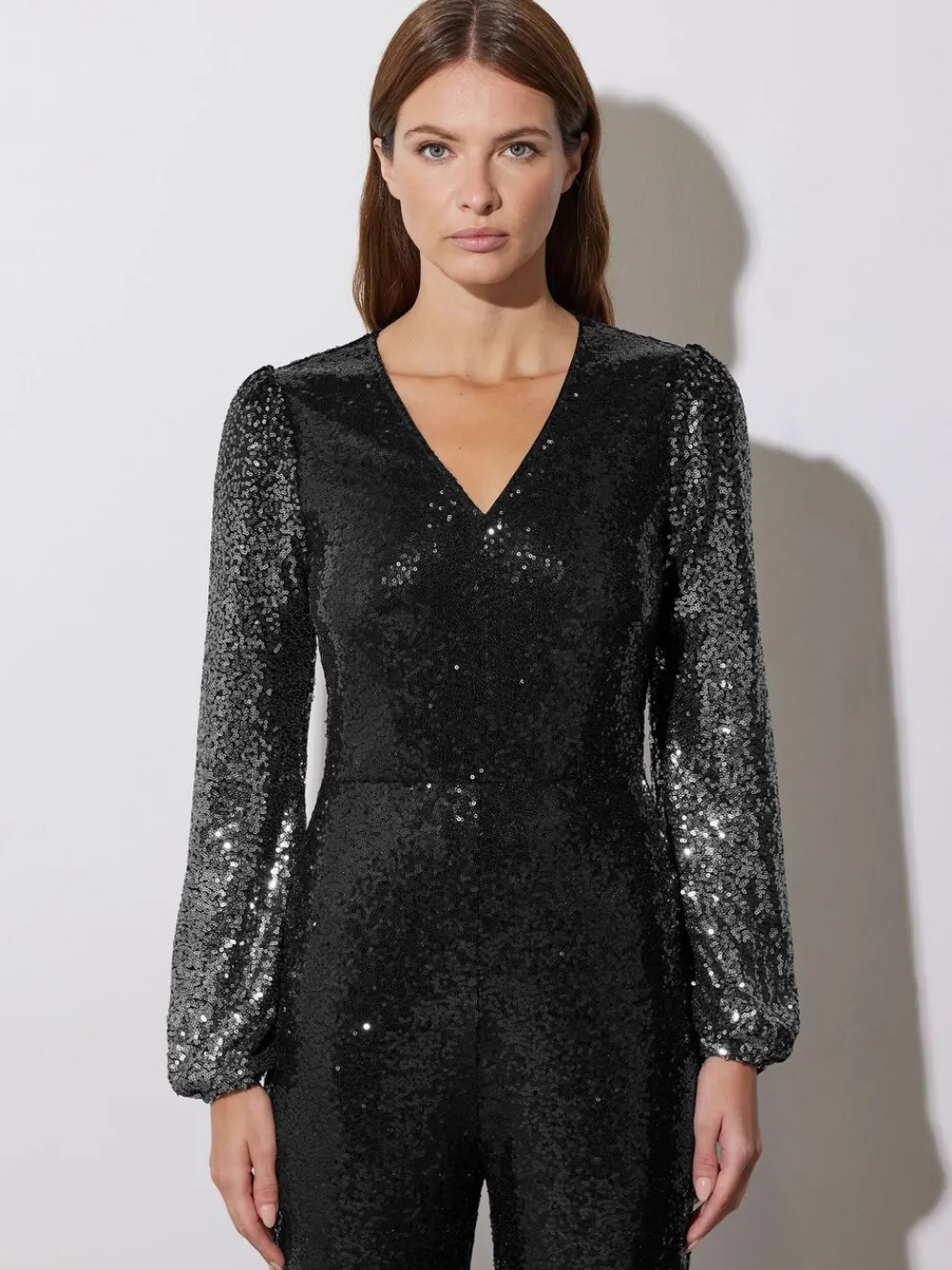 Style Notes: Make a captivating entrance in our new sequin jumpsuit. Crafted from a figure-fitting fabric, it features sequin embellishments, a deep V-neckline, and is complete with a zip fastening. Style with heels for a timeless look. Machinewasbaar. 95% polyester, 5% elastaan.