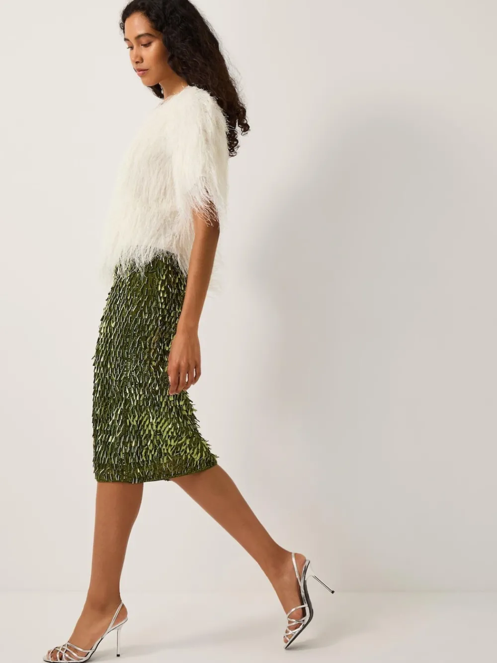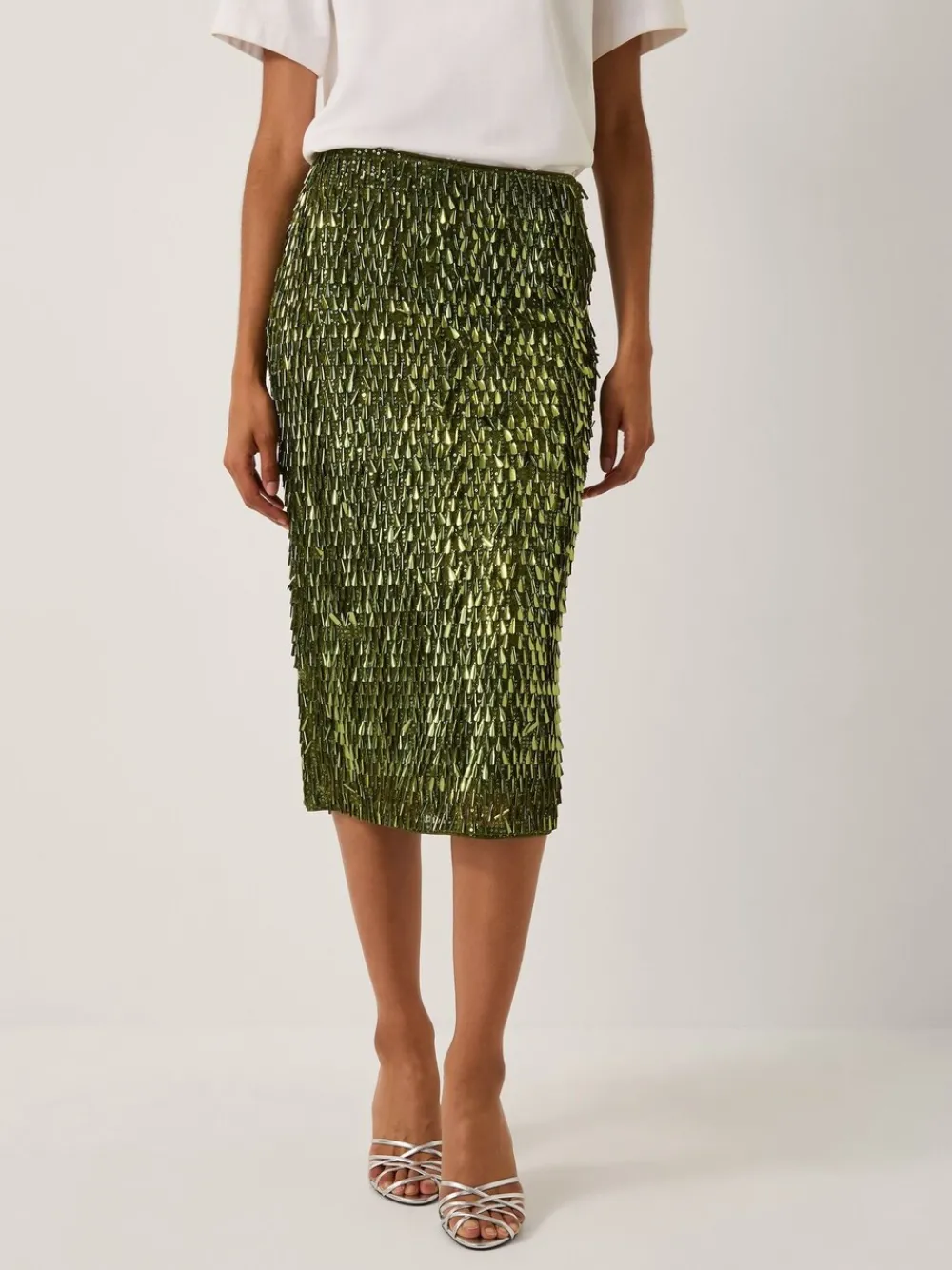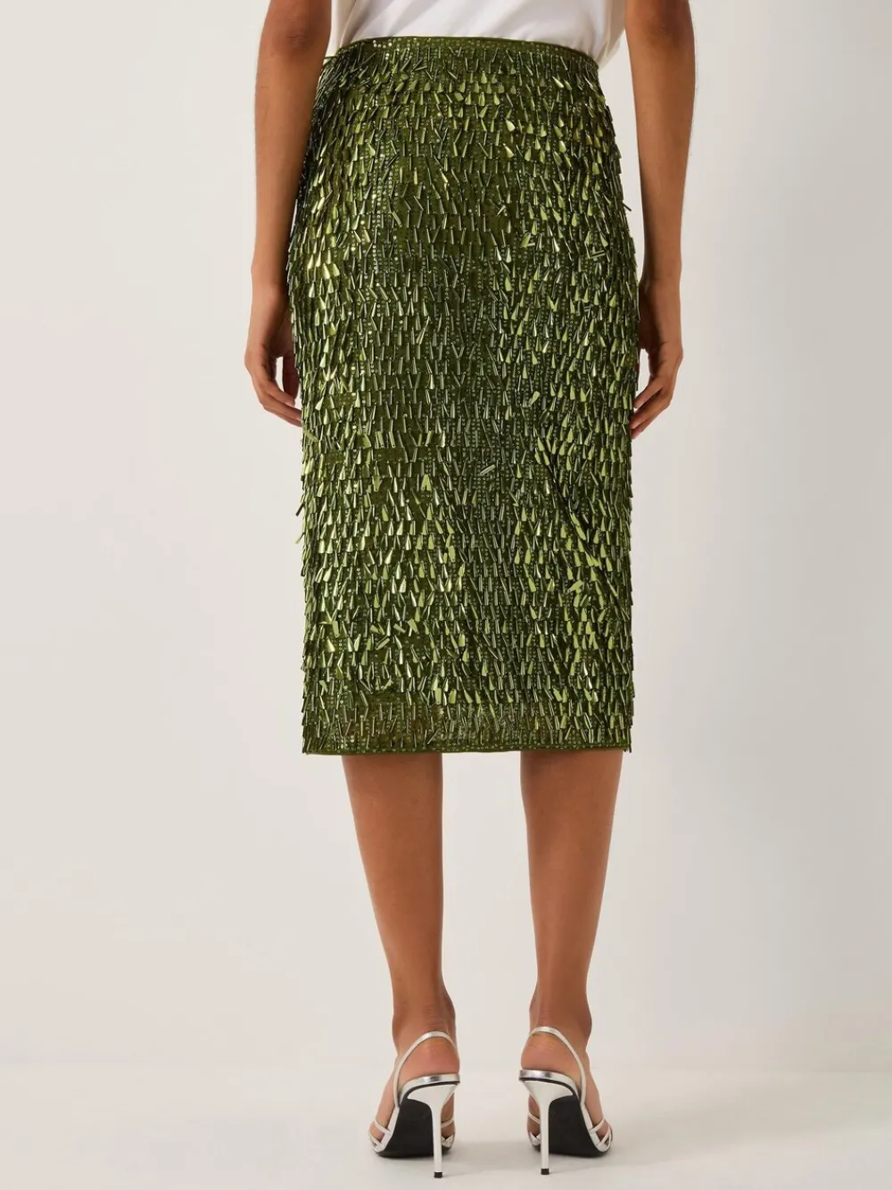 Dare to dazzle. Perfect for special occasions, this midi skirt is doused in shimmery green sequins that catch the light with every turn. Wondering how to style it? Pair it with a neutral top and strappy heels for an effortlessly chic look. Machinewasbaar. 100% polyester.