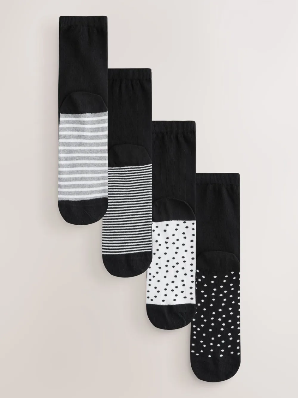 Refresh your everyday essentials with this practical four pack of ankle socks in black and white patterns. Featuring a variety of stripe and spot prints, they offer style and comfort. Designed with a footbed for enhanced support, these are ideal for everyday wear and casual styling. Ankle-height socks Assorted spot and stripe prints Footbed detailing Supplied as a four pack 80% katoen, 18% nylon, 2% elastaan. BI-OME® Natural is een speciaal ontworpen technologie die je sokken fris en geurvrij houdt. Dit product bevat biocide lijnzaadolie.