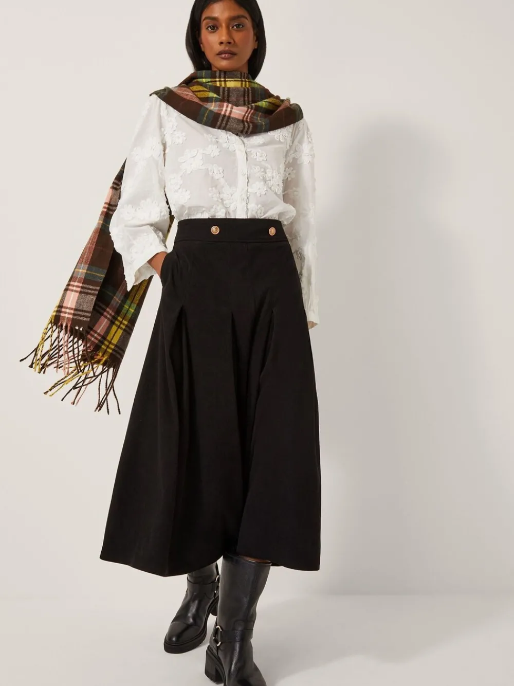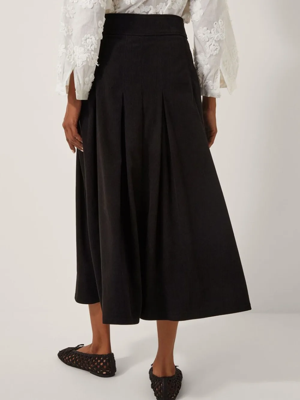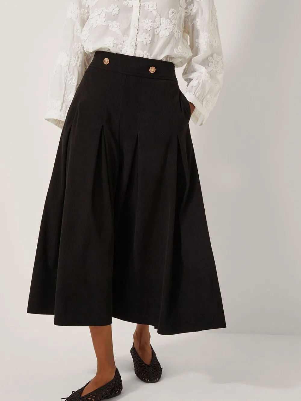 A for A-line! Sophistication with a retro-inspired twist, this midi skirt is cut from soft corduroy imbued with a comfortable stretch. Finished with gold-tone buttons and a discreet side zip fastening, it’s the perfect accompaniment to tucked-in blouses and ballet pumps. Machinewasbaar. 100% polyester.