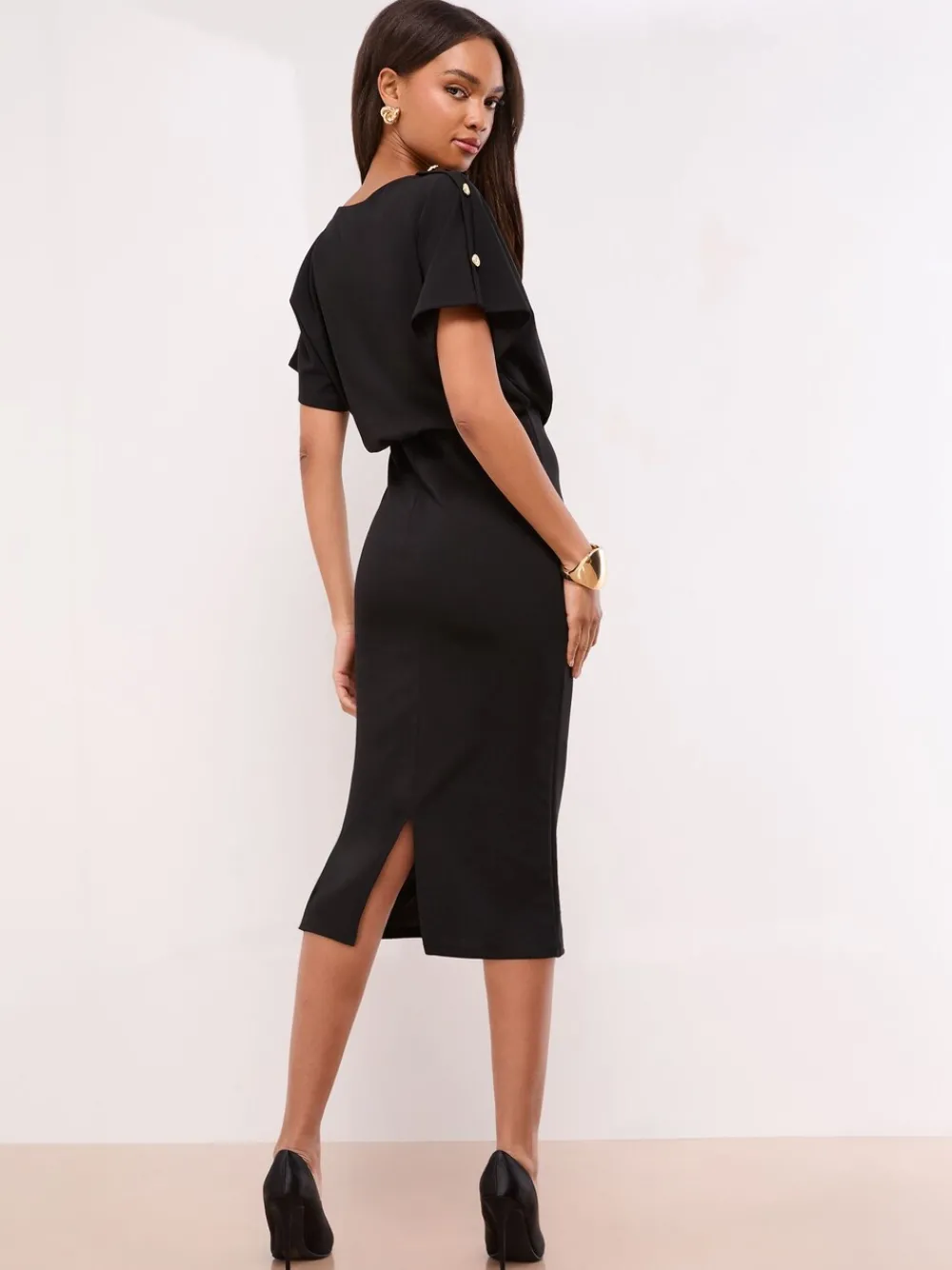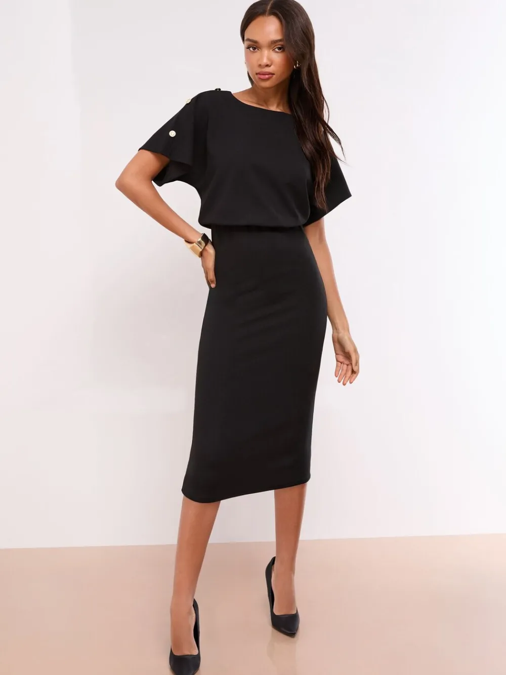 Achieve a very smart and sophisticated look in this perfect desk-to-dinner dress. The midi features a flattering blouson top with short sleeves and a cinched bodycon skirt for an elegant silhouette. Subtle military button detailing on the shoulder adds a chic finish. Pair with heels or flat pumps for varied looks. Crew neck, short sleeves Blouson top and bodycon skirt Midi length Military button detail Desk-to-dinner occasionwear Hoofdbestanddeel 96% polyester, 4% elastaan. Voering 100% polyester.