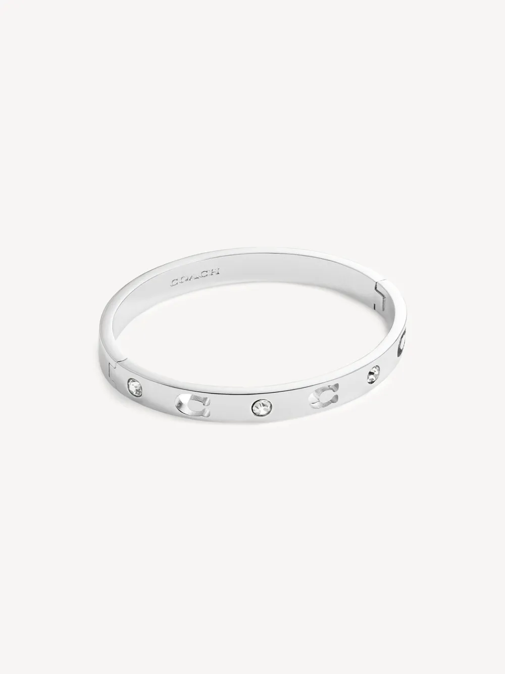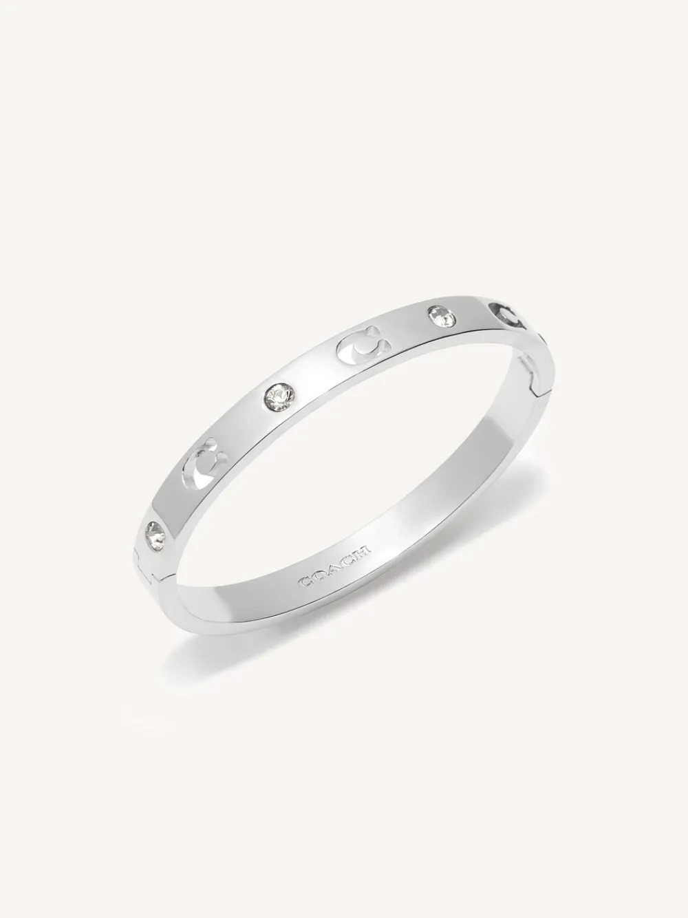 Een alledaagse armband met scharnieren, versierd met minimale kristallen stenen en de kenmerkende gebeeldhouwde C-uitsparingen. De armband sluit met een eenvoudig scharnier. Gemaakt van messing en kristalglas. Inclusief COACH-tasje. 70% koper, 30% glas.