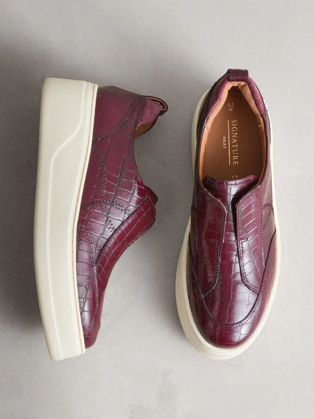 Step up your casual game with these striking burgundy croc effect Signature leather chunky wedge platform trainers. Crafted from soft suede, they feature a fashionable chunky sole and a comfortable slip-on design. The Forever Comfort® padding ensures superior all-day wearability. Suede upper Forever Comfort® padding Chunky sole Slip-on design Bovenwerk – leer; voering en voetbed – Andere materialen, textiel, zool – Andere materialen.