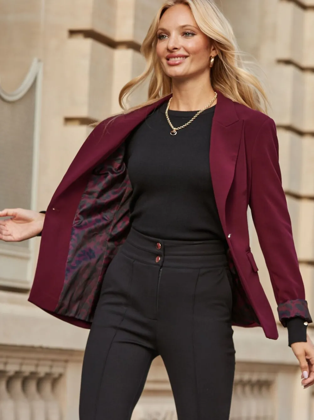 Just the thing your wardrobe’s been missing flattering single-breasted silhouette, nipped in at the waist with a luxe gold button fastening. You’ll love the leopard print lining. You’re going to need the matching trousers. Slip our burgundy cami underneath for an on-trend tonal look. Model is 5’9″ and wears a UK size 8. Alleen chemisch reinigen. Hoofdbestanddeel 92% polyester, 8% elastaan. Voering 100% polyester.