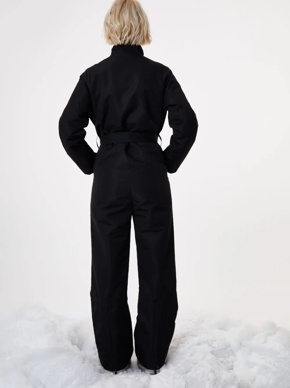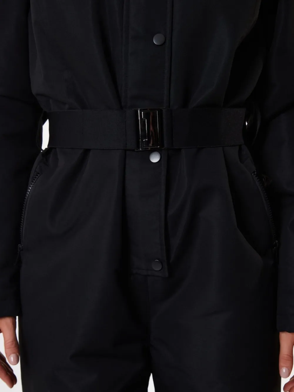 Stay chic on the slopes with this ski jumpsuit from Threadbare. Funnel neck. Concealed front zip with snap fastening. Long sleeves with ribbed storm cuffs. Elasticated belt at the waist with a metal clasp. Leg hem zips. All-over flat padding and fully lined. Model wears UK size 8. Machinewasbaar. 100% polyester.