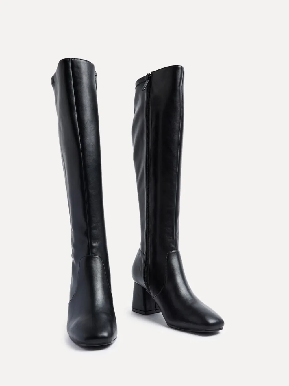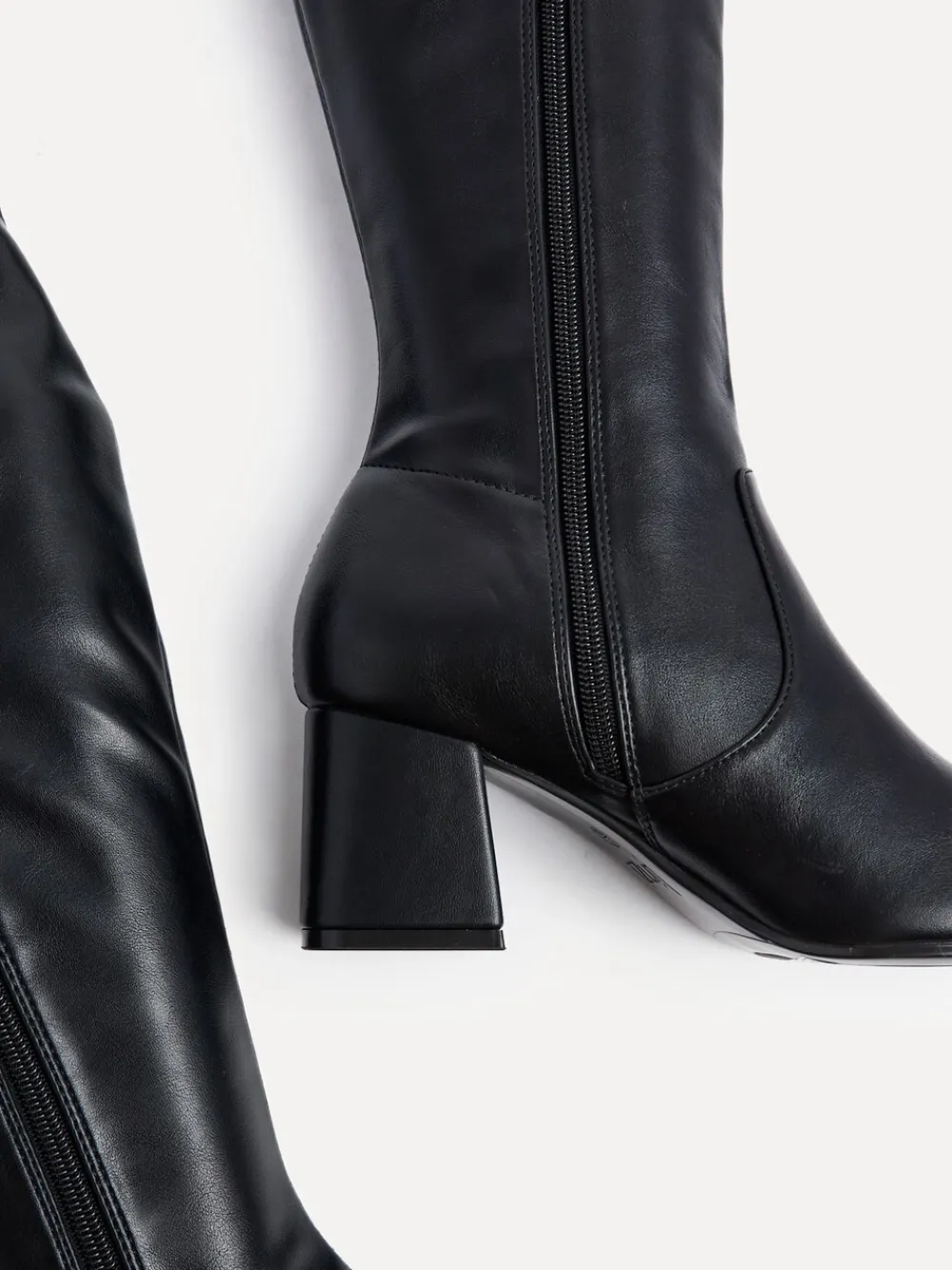 Step in luxury with our Slate knee high boot. Featuring a square toe and full size zip for easy wear. Designed for style and convenience with a block heel and padded insole. Perfect for elevating any outfit. Boot length: 40cm. Hakhoogte 6,5 cm. Bovenwerk – 100% andere vezels, Voering. en sokken – 100% overige vezels. Zool – 100% rubber.