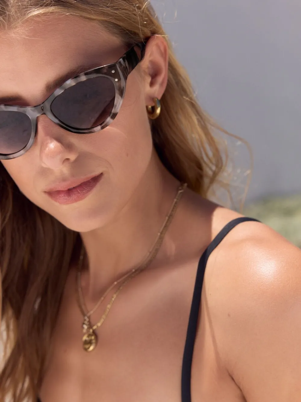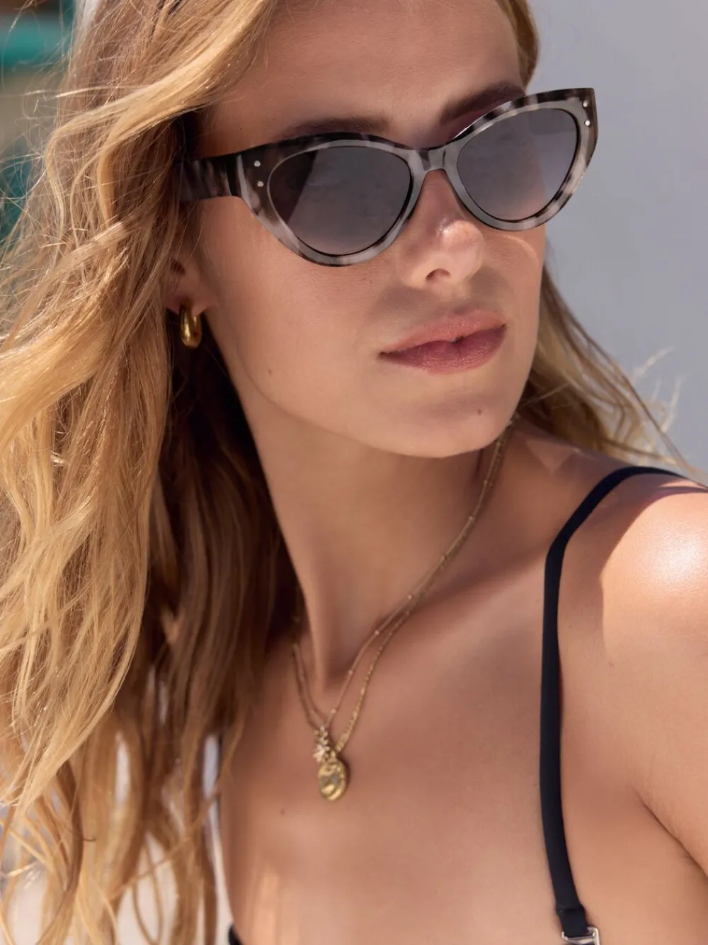 Deze chique, tijdloze en stijlvolle zonnebril heeft een montuur in de vorm van een kattenoog met getinte lenzen en biedt bescherming volgens filtercategorie 3 . Cat-eye vorm Getinte lenzen Filtercategorie 3 100% gerecycled polycarbonaat. Hoge mate van bescherming tegen schittering van de zon