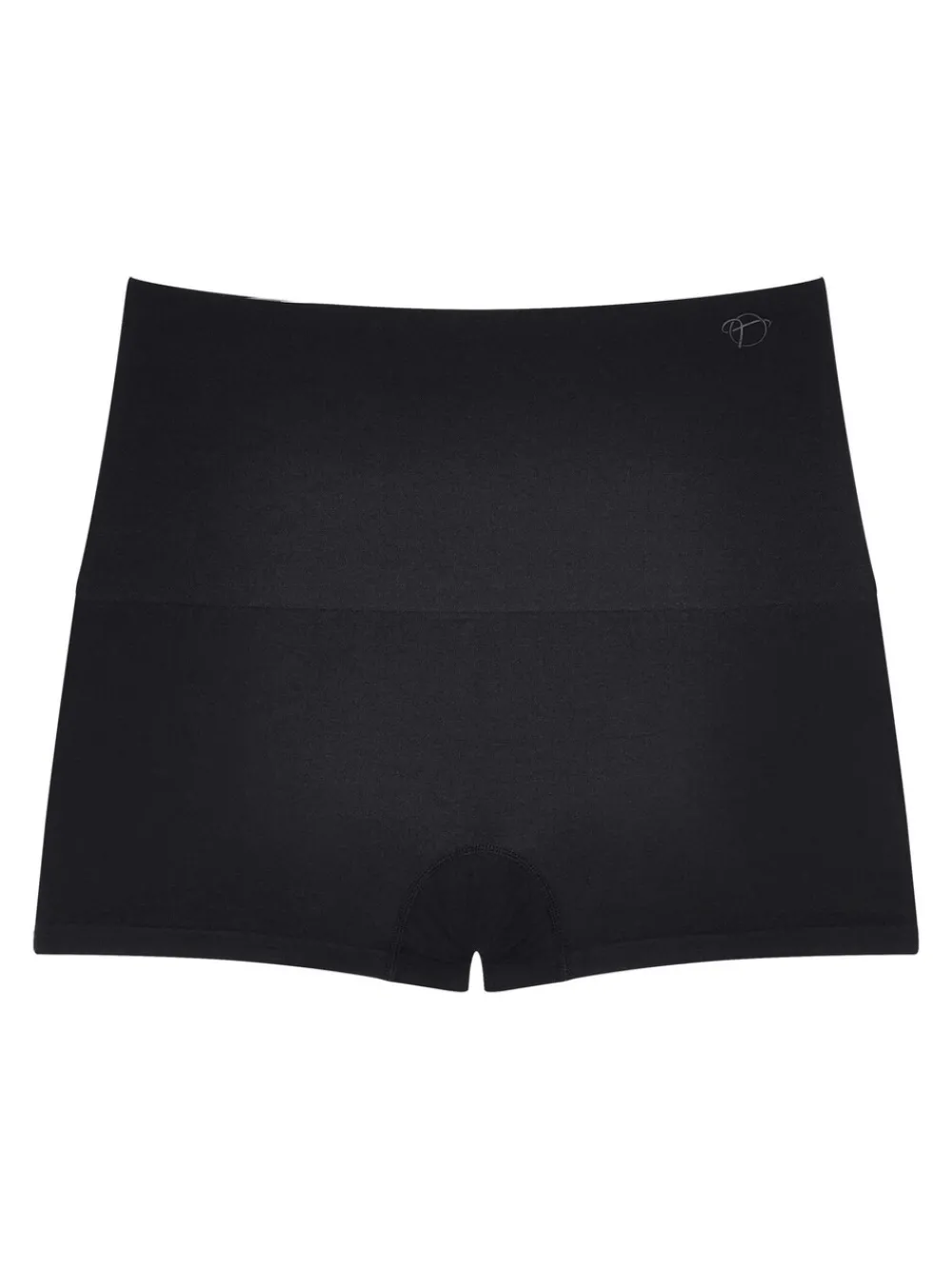 Zeer dekkende korte zwarte slip van glad, zacht breisel Gebreide bandeau tailleband met medium buikondersteuning Gepreegd merklogo Zachte biezen en platte naden bij de beenopeningen voorkomen ongemak en insnijden Machinewasbaar. 78% Nylon, 22% elasthaan.
