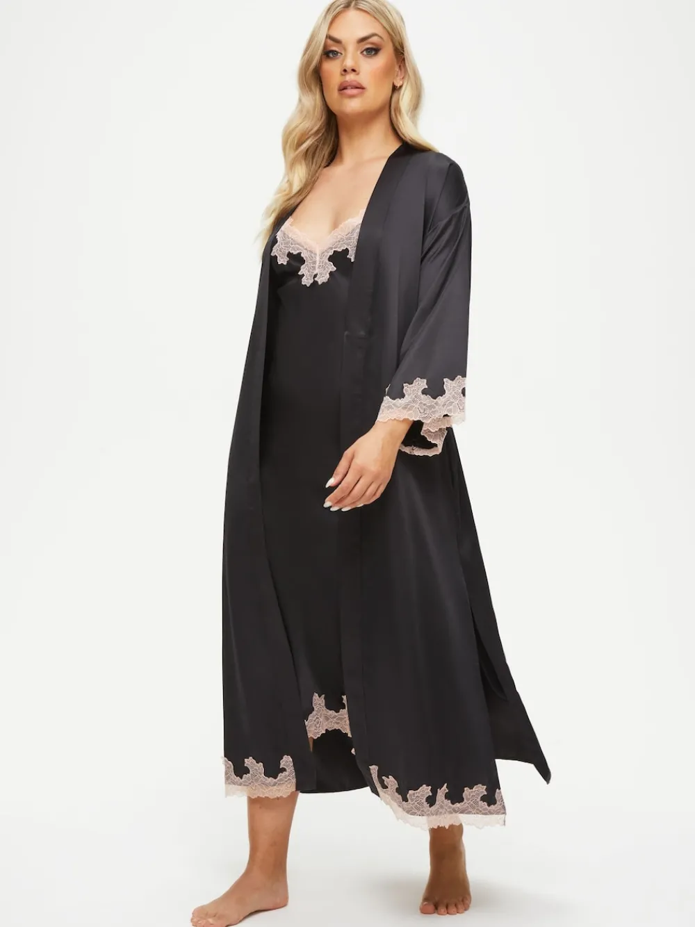 Looking just as good as you feel never felt so easy in the Sorella Maxi Robe. This gorgeous piece features delicate lace detailing to the hem and cuffs.Complete with a tie waist, hidden pockets and maxi length with a sexy thigh split. Pair with the Sorella Chemise for a perfect post-date look¦ Belle wears a size Small. Machinewasbaar. 100% polyester. Waarschuwing: weg houden bij vuur en vlammen.