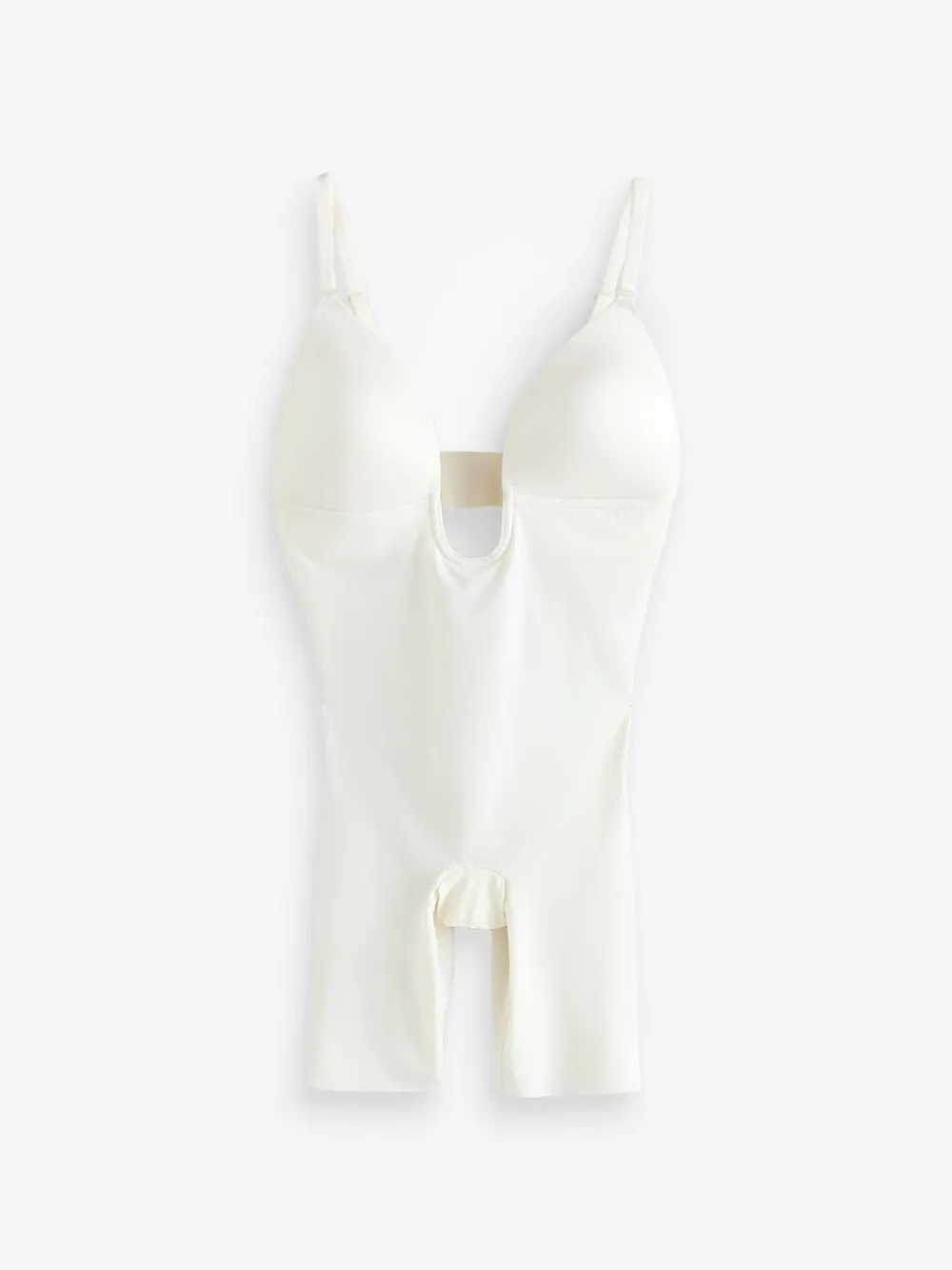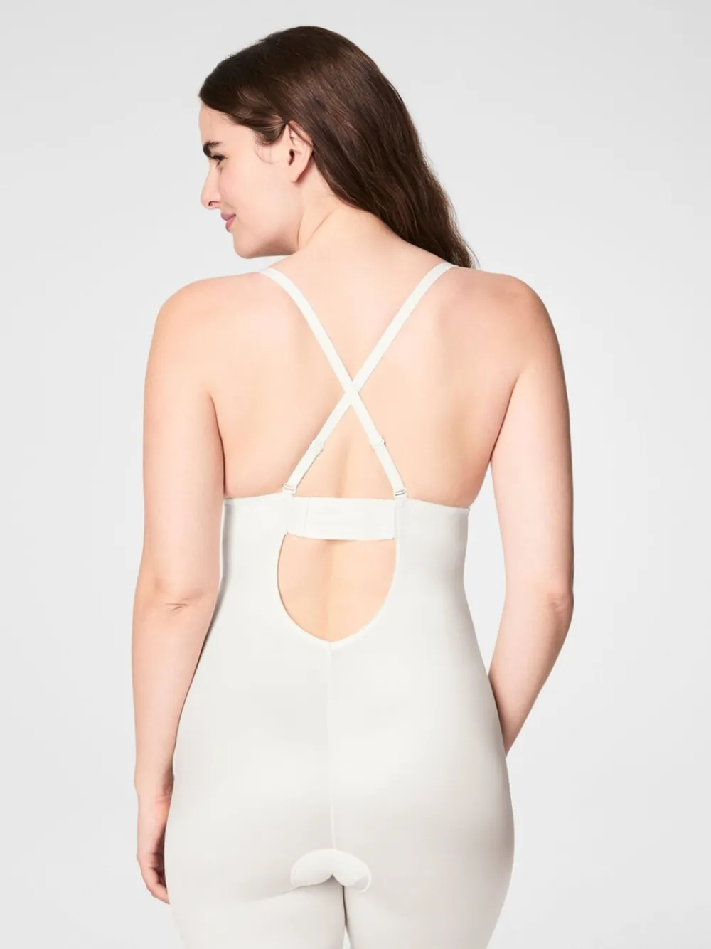 This low-back mid-thigh bodysuit provides all-over compression to shape and support your figure. Designed with cling-free fabric, a plunging neckline, and innovative low-back design, it goes undetected beneath your most daring dresses and special occasion outfits. Plus, with a no-slip silicone waistband that eliminates rolling and folding, free-cut hems that don’t squeeze or dig, and fabric that prevents thigh chafing, this bodysuit shapewear is perfect for all-night wear. Adjustable and convertible straps make this your go-to, versatile bodysuit for those very specific silhouettes that require very specific shapewear. Hoofdbestanddeel 51% elastaan, 49% nylon. Inzetstuk 80% nylon, 20% elastaan.