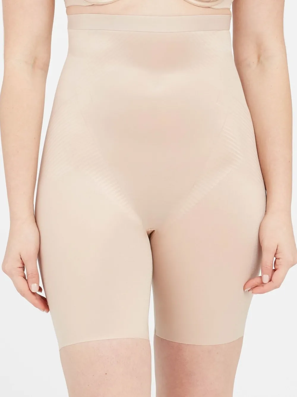 Experience lightweight and powerful compression with our SPANXshape™ Invisible High-Waisted Mid-Thigh Short. Featuring advanced single-layer Printed Power® shaping technology made with LYCRA® FitSense™ Print Technology, this short includes targeted tummy control panels that wrap around for 360-degree shaping. Designed with ultra-thin, breathable fabric that is moisture-wicking and quick-drying, a cotton gusset for comfort, a no-slip, no-squeeze silicone waistband that prevents rolling, and no-dig flexible leg openings, this high-waisted shapewear prevents thigh-chafing and goes undetected under any outfit. 72% Nylon, 28% elasthaan.