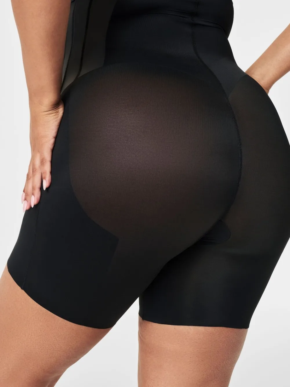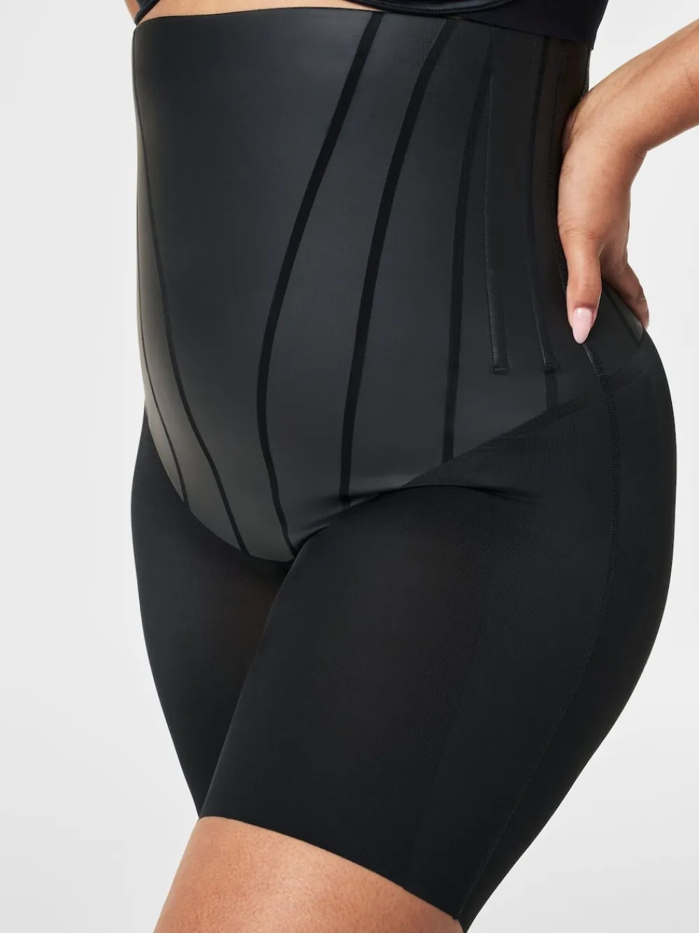 SPANXsupersculpt™ TotalContour High-Waisted Mid-Thigh Short is your new go-to for ultra-powerful sculpting that transforms your curves. Powered by flexible, built-in boning and LYCRA® FitSense Print™ Technology for added waist, core, and thigh support, this shapewear is engineered for 360-degree sculpting to deliver that cinched hourglass shape. Featuring a stay-put silicone waistband for a no-roll, no-shift fit and back seam shirring to define and lift your booty, this shapewear is breathable, quick-drying, and provides our strongest compression that will have you feeling oh-so-snatched. Body 66% Nylon, 34% Lycra® Elastane. Gusset 80% Nylon, 20% Elastane.